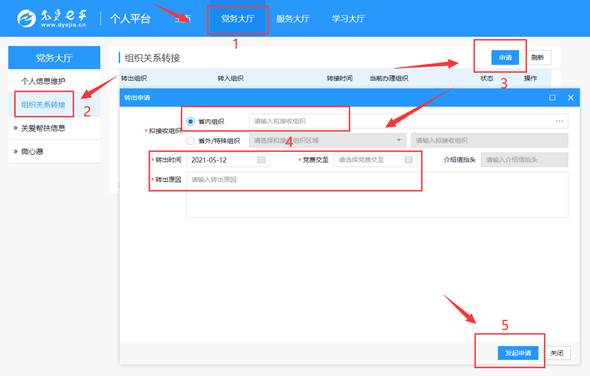 党员登录“党员e家”平台(www.dyejia.cn)→点击“登录”→登录个人平台→进入“党务大厅”→选择“组织关系接转”→点击“申请”→选择“省内组织”→填写拟接收党支部名称(咨询单位党务秘书或组织员)→填写其他转出信息→点击“发起申请”,等待党组织逐级审批。如下图所示。