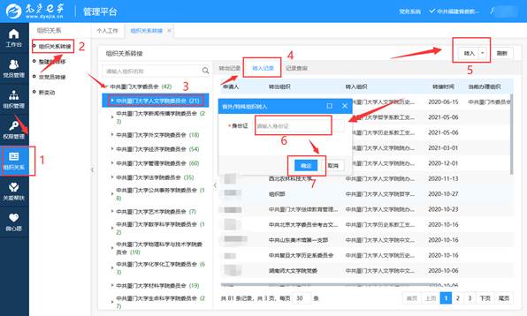 原所属党组织系福建省以外的党员,到校后需在介绍信有效期内将纸质党员组织关系介绍信交到所在单位党组织。转入基层党委的,由基层党委审查过党员档案后统一在“党员e家”-福建省党员教育管理综合服务平台为党员办理网上转入手续。转入基层党总支的,先经基层党总支审查,再由校党委组织部/党建办办理网上转入手续。基层党委为党员办理网上转入程序如下。