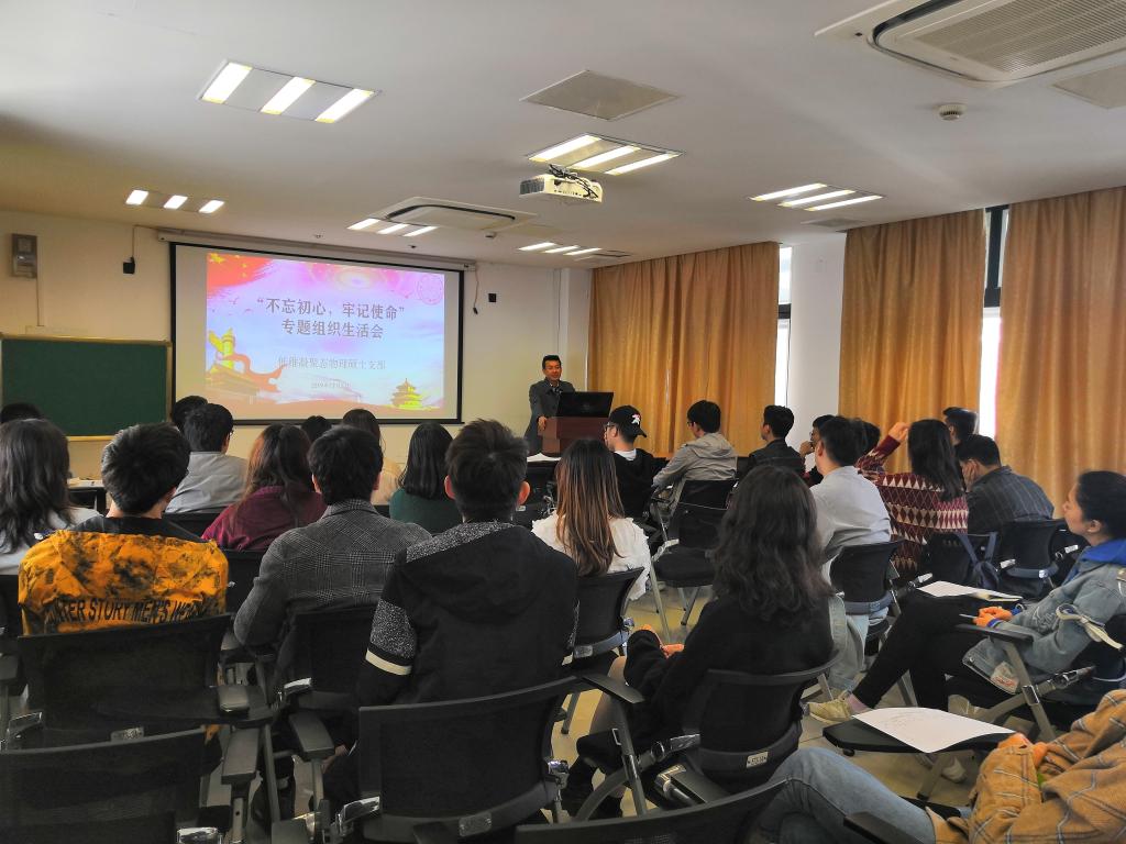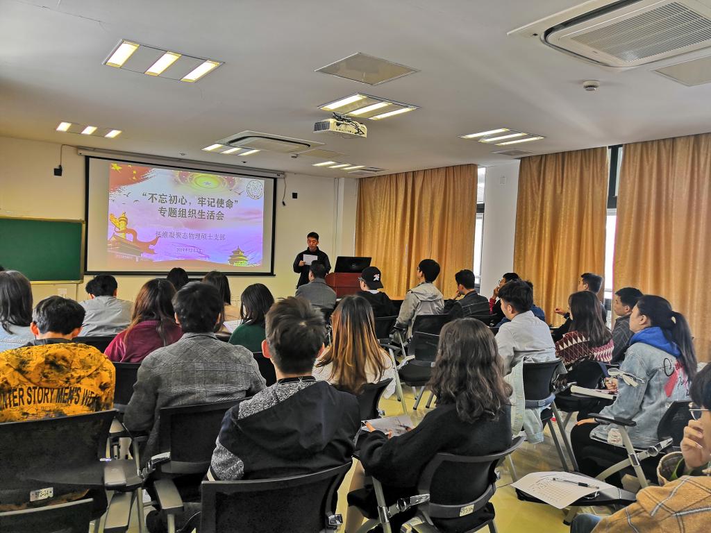 2019年12月3日中午,低维凝聚态物理硕士支部在海韵教学楼573召开了“不忘初心、牢记使命”专题组织生活会。学院党委书记林奋强、低维凝聚态物理硕士党支部全体党员参加了会议。会议由党支部副书记孙保帆同学主持召开。
