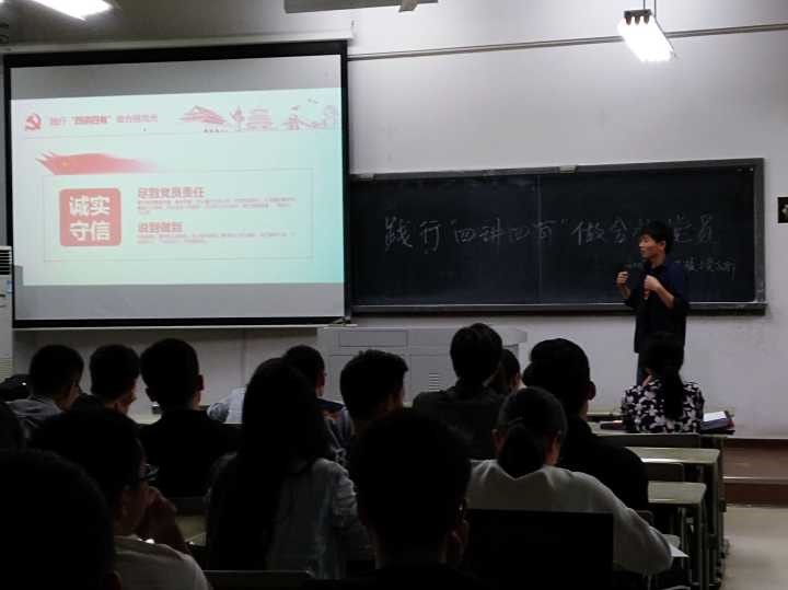 本次会议的形式主要以PPT展示和同志之间交流讨论为主,支部书记何冰首先对于支部内部前期民主生活会的学习情况进行了简单的总结,并且向各位同志介绍了支部的近况。对于日后党内活动如何组织开展,如何才能做到最大程度地调动党支部全员的活动参与积极性这些具体问题,支部成员集思广益提出了诸多有价值的建议。在学习“四讲四有”过程中,大家首先学习了“四讲四有”的具体阐释:讲政治,有信念;讲规矩,有纪律;讲道德,有品行;讲奉献,有作为。党支部书记何冰还举例一些没有真正践行“四讲四有”的党员作为反面教材来警醒各位支部成员,要提高自身党性素养,真正做到“四讲四有”,争做合格党员,要做到在党爱党,在党为党,在党护党。