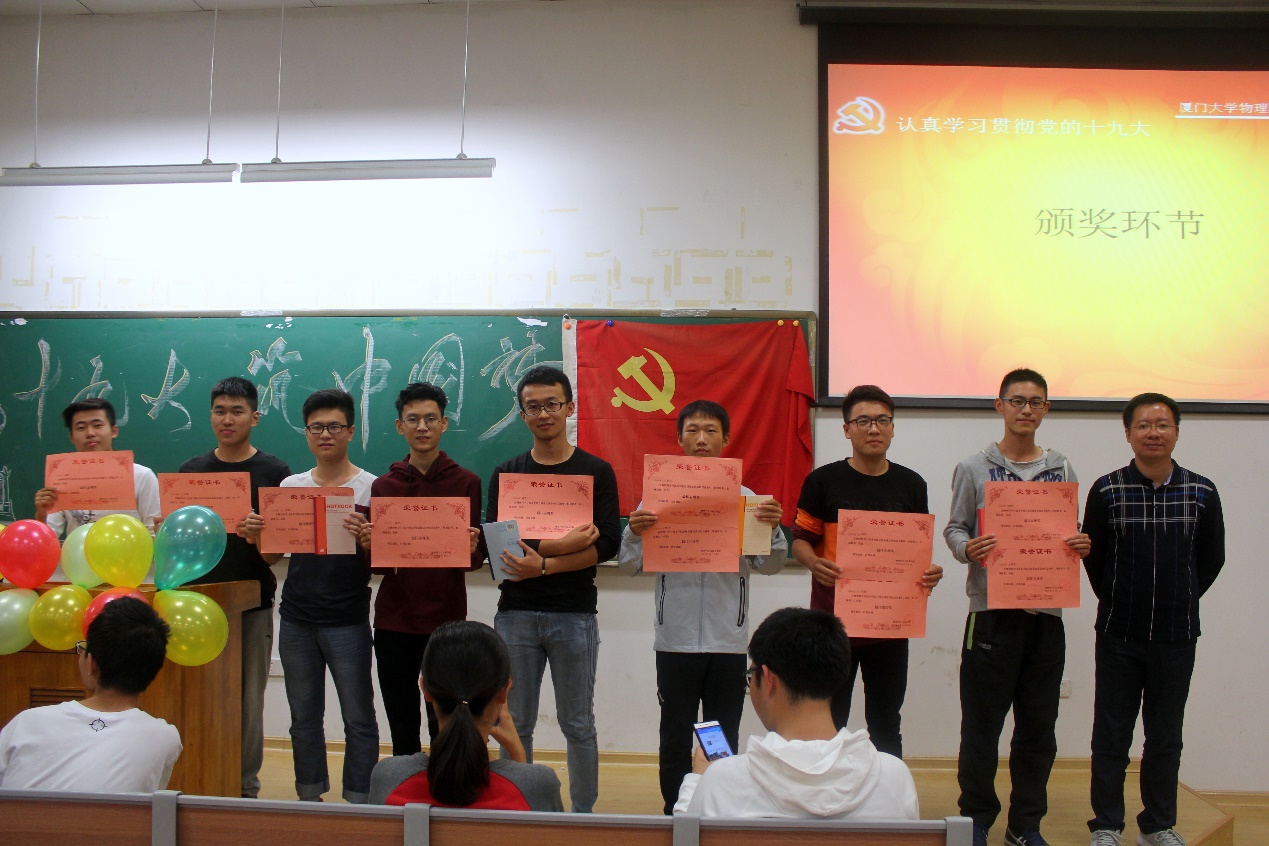 首先,各个班级精心挑选出3位参赛队员,共组成8支代表队,每只代表队分别上台进行介绍。其中,2017级组建了三只代表队:物理一班、物理二班、物理三班 ,他们提出“弘扬辅导员精神”、“时代召唤青年,青年召唤未来”的口号,引起现场的强烈反响;2016级组建了物理、天文、微电子、电科一班、电科二班共五只代表队,他们提出“物理科创未来”、“青春的底色永远是奋斗,奋斗不止,青春不息”、“勿忘初心,奋勇前行”、“学习党的十九大,共筑中国梦”等一系列充满正能量的口号,获得现场的一致好评。