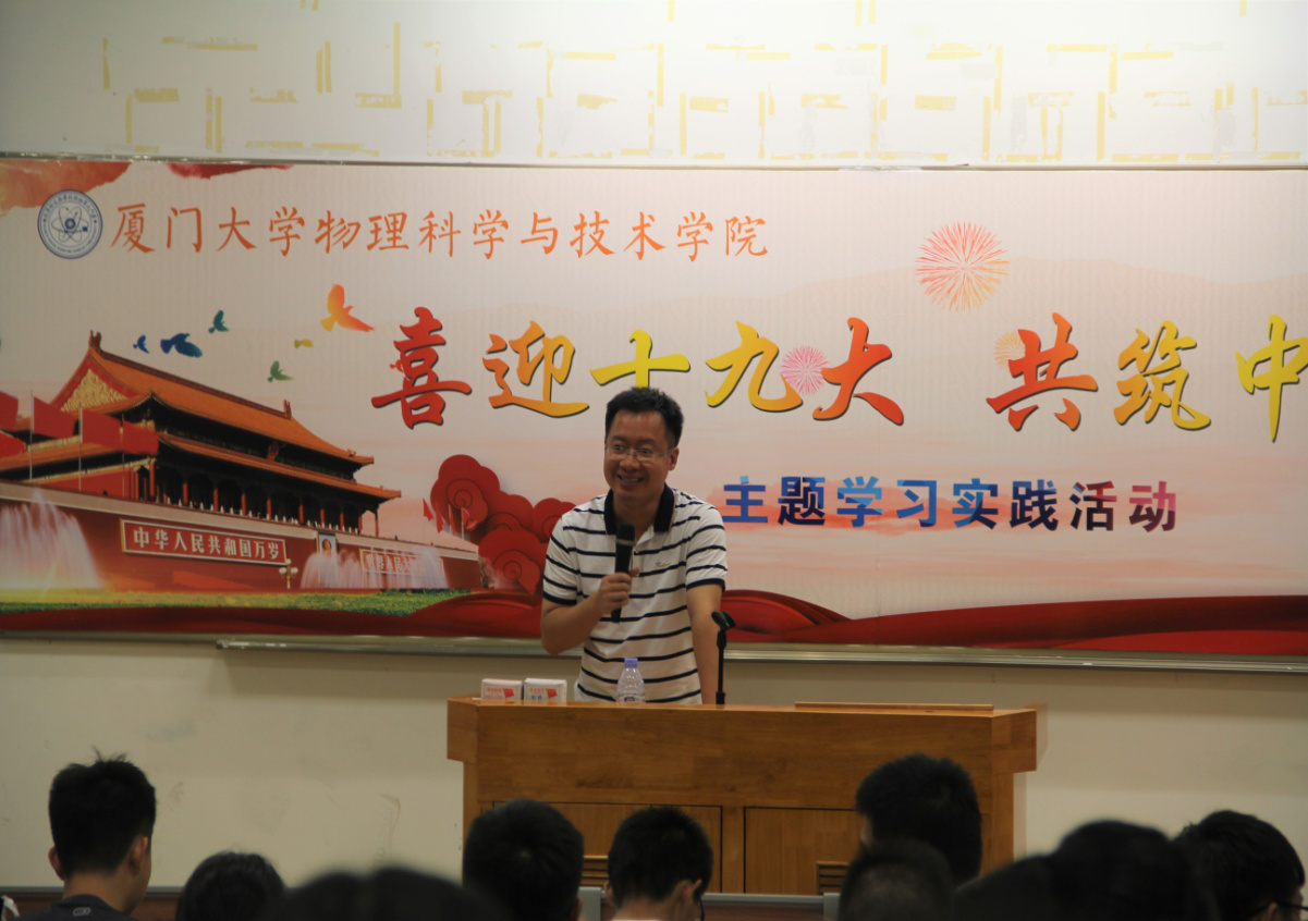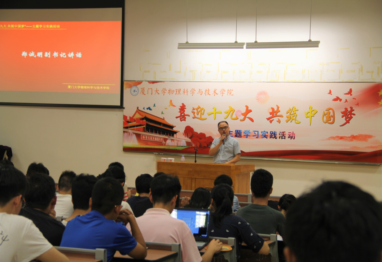 10月13日晚19:00,物理科学与技术学院本科生“喜迎党的十九大,共筑中国梦”主题学习实践活动在物理大楼117报告厅举行。我院党委副书记郑诚明老师、团委副书记陈洪老师、辅导员邱丹文老师以及2015级、2017级全体同学参加了此次学习活动。