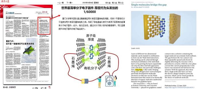 谈到科研基金时,杨扬说到,“科研经费都是纳税人的钱。作为一名科研工作者,尽全力让每一分经费都产出成果,是我们的义务。”为此,他主动以国家的战略需求和学校的战略布局为导向,进行科研聚焦,把研究方向确定为核心芯片的制备和研发以及石墨烯等二维材料的性质研究。在科研工作上,杨扬潜心钻研、勤奋刻苦。杨扬指导的硕士生王干在毕业论文的致谢中写到,“科研的道路是辛苦的,您(杨扬)经常会为了写基金、改论文而工作到深夜,第二天一早6点又起来,充满精神地去工作。”功夫不负有心人,在杨扬和所指导学生的共同努力下,目前共以第一作者或通讯作者发表SCI论文21篇,其中中科院一区论文10篇。他们关于分子电子器件的极限尺寸的工作,发表于《Chem》,相关成果得到国家自然科学基金委官方网站的报道;关于石墨烯范德华异质结器件的工作,发表于《Science Advances》,相关成果则是得到了《科技日报》和《Nature Electronics》的报道,取得了较好的社会影响。