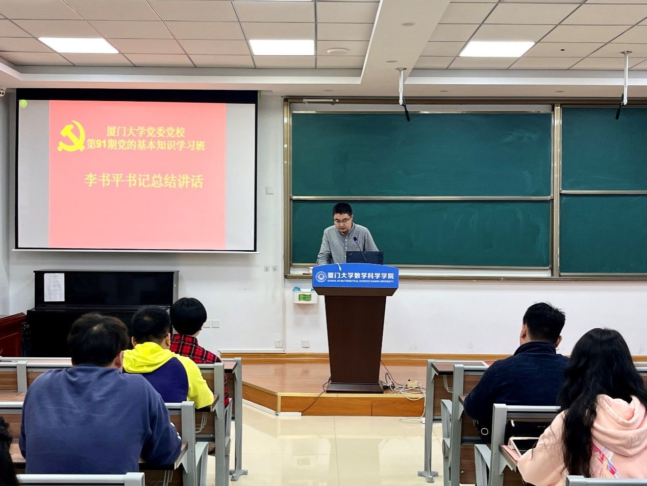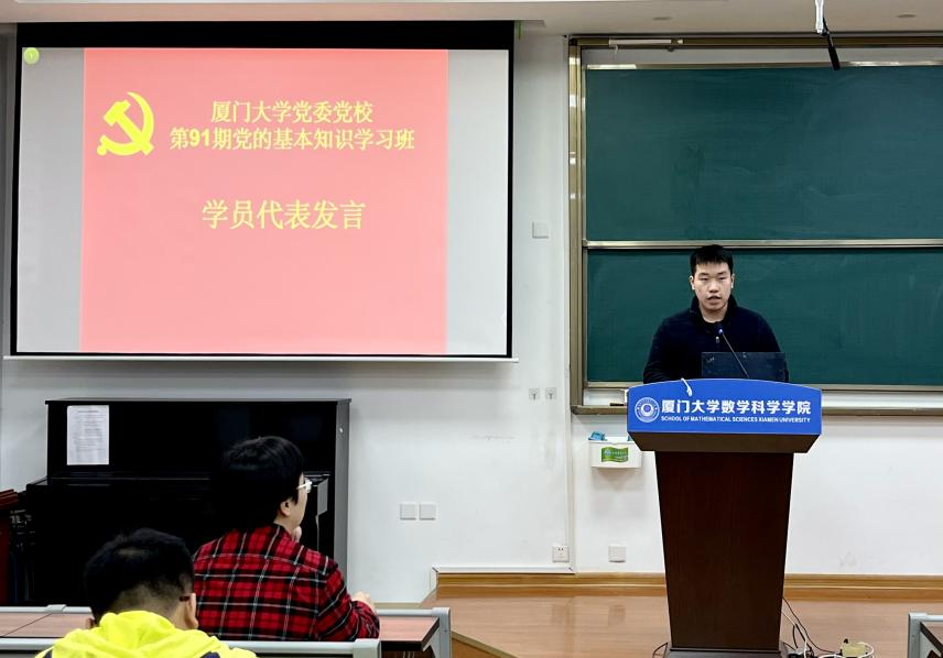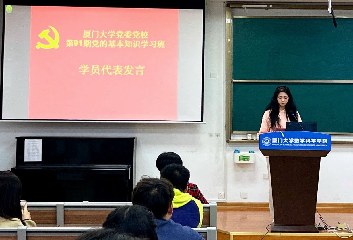 两位学生代表结合学习内容,分享了自己的感想与收获。物理科学与技术学院2020级本科生王雯璐表示,作为新时代青年,要深刻领会党的二十大精神,肩负使命担当,锤炼过硬本领,把个人奋斗的小目标融入党和国家的大蓝图中,唯有如此才能在中国式现代化建设中贡献青春力量。数学科学学院2021硕士张波恩表明,希望同学们加入中国共产党后,能秉承厦大数学的光荣传统,充分发挥共产党员的先锋模范作用,汇聚起磅礴的青年力量,在社会主义现代化建设的浪潮中挥洒汗水,以中国式现代化全面推进中华民族伟大复兴。
