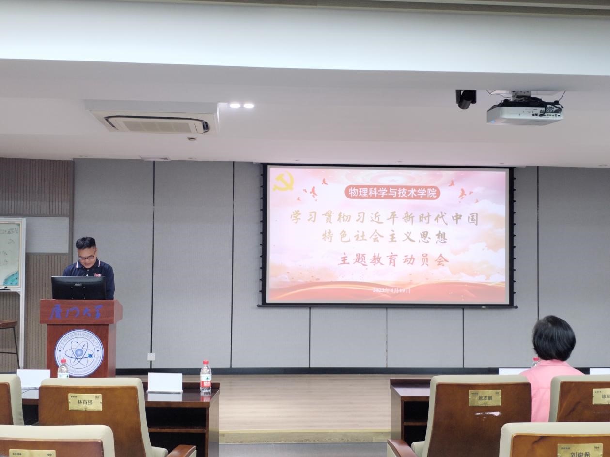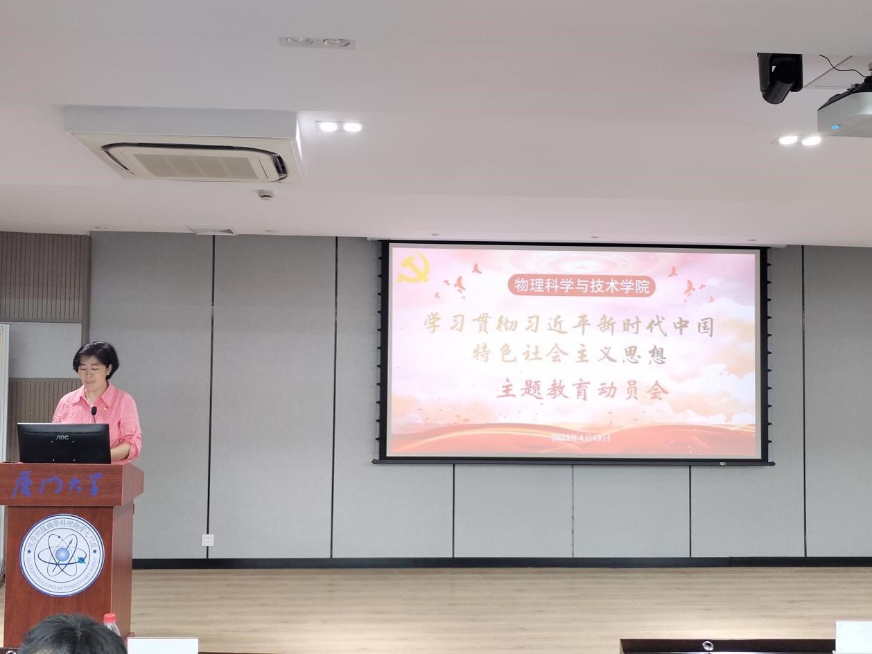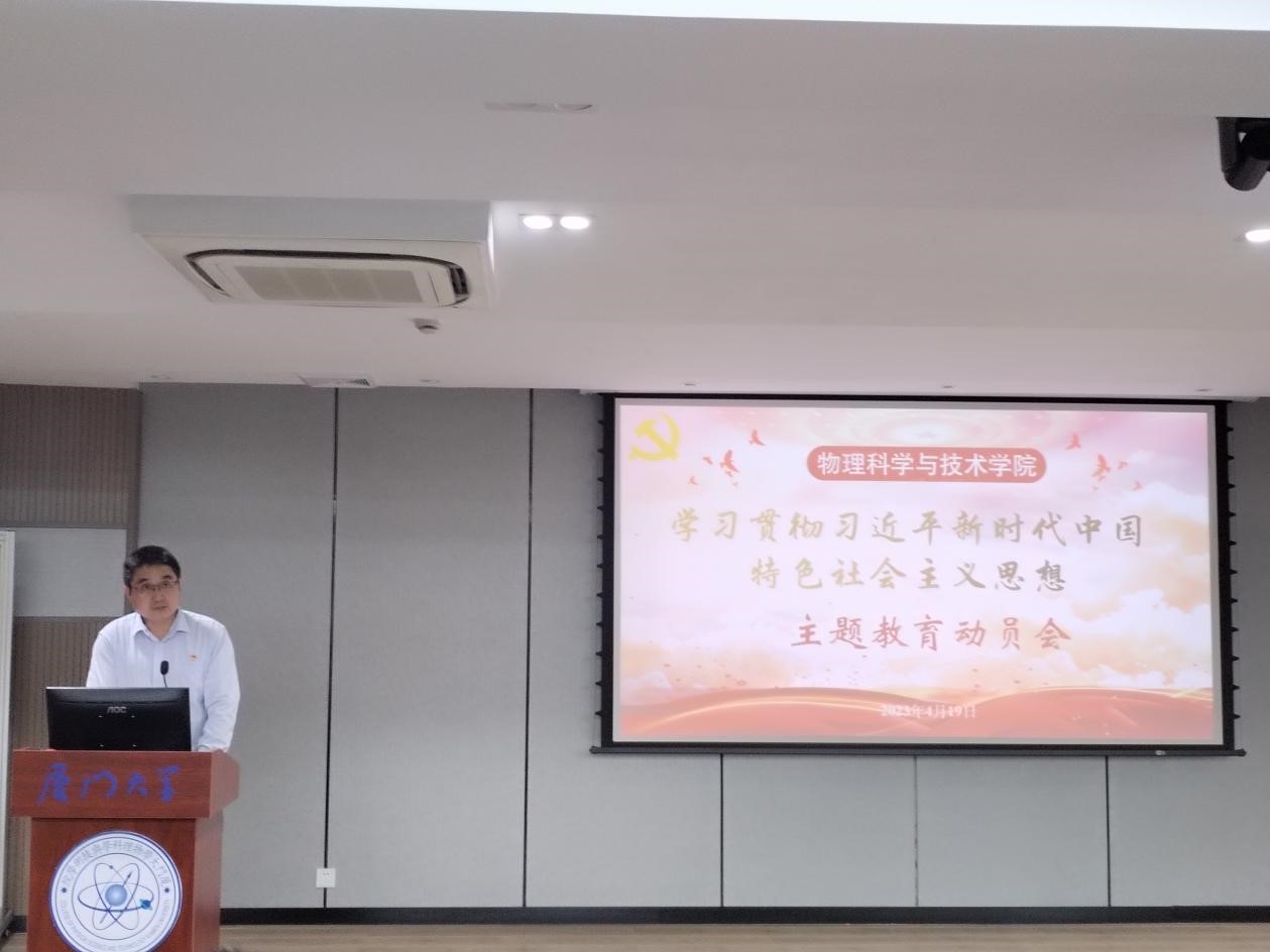 为贯彻落实习近平总书记在中央主题教育工作会议上的重要讲话精神,动员部署学院主题教育工作。2023年4月19日下午,物理科学与技术学院在海韵校区物理大楼552会议室,召开学习贯彻习近平新时代中国特色社会主义思想主题教育动员会。学校主题教育第二巡回指导组副组长赵晓慧,基层党建联络员陈正国出席指导,物理科学与技术学院党委书记李书平出席会议,学院其他党委委员,二级纪检委员、党员系级负责人,党支部书记、副书记、委员,党务秘书、辅导员、师生党员代表参加会议。本次会议由学院党委副书记郑诚明主持。