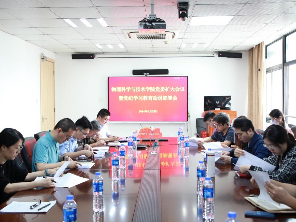 4月19日,物理科学与技术学院在物理大楼 407 会议室召开学院党委扩大会议暨党纪学习教育动员部署会,传达学习4月12日学校党委常委会(扩大)会议精神,专题研究部署学院党纪学习教育工作,学院党委书记李书平主持会议,学院党委委员、学院纪委委员、全院各支部书记、院办主任、党务秘书、辅导员参加会议。