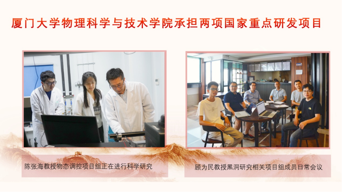 近日,厦门大学物理科学与技术学院承担的两项国家重点研发项目——陈张海教授物态调控项目、顾为民教授黑洞研究相关项目分别正式启动。国家重点研发计划聚焦国家战略急需、应用导向鲜明、最终用户明确的攻关任务,是实现科技强国的有力保障。近年来,学院坚持以高质量党建组织高质量科研,为重大任务攻坚、重大成果产出提供了坚强的组织保障。学院将进一步探索前瞻性领域,在量子信息、半导体、天文等前沿科技领域开展深入研究,强化科研方向和国家重大战略需求衔接,努力为实现我国高水平科技自立自强贡献厦大物理的力量。