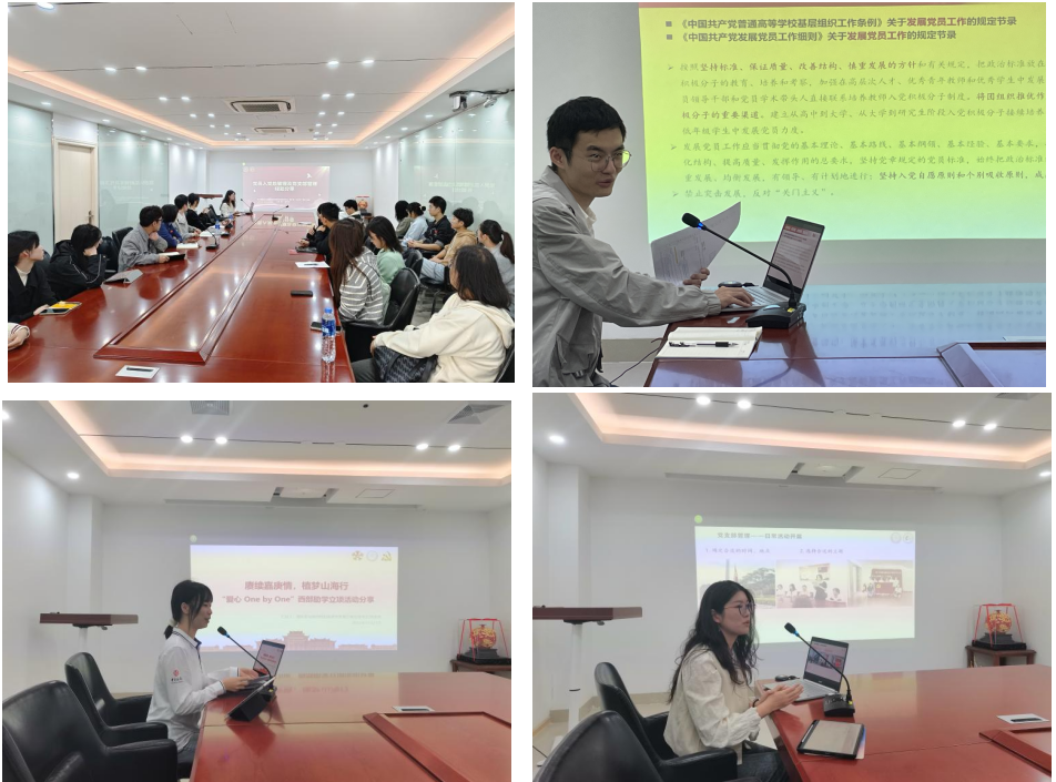 第六期“扬才班”学员、外文学院2023级硕士研究生第三党支部书记徐诺围绕党员教育管理监督工作,从党员e家、党校学时系统操作和党费收缴、支部活动的组织出发,系统讲解了学生党支部日常工作思路、内容、方法。第六期“扬才班”学员、建筑系与城市规划系研究生第三党支部书记陈玉珠介绍校党支部工作“立项活动”优秀成果二等奖项目——“爱心One by One”西部助学活动,对项目背景、工作思路和实施情况作了详细介绍,为我院下一步打造高品质党建品牌项目提供了参考。