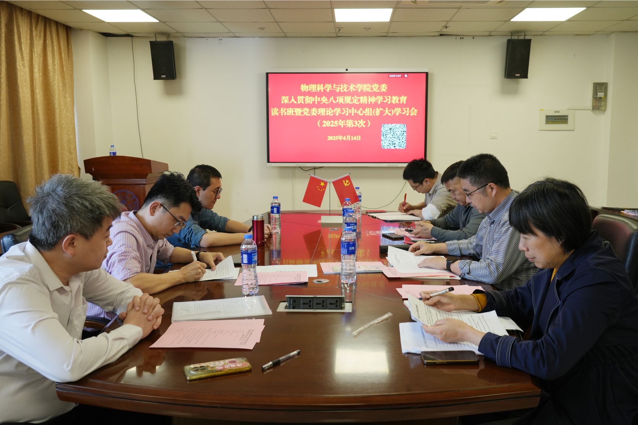 2025年4月14日下午,厦门大学物理科学与技术学院党委召开深入贯彻中央八项规定精神学习教育读书班暨党委理论学习中心组(扩大)学习会议。学院处级领导干部、党委委员参加了会议。会议由院党委书记李书平主持。