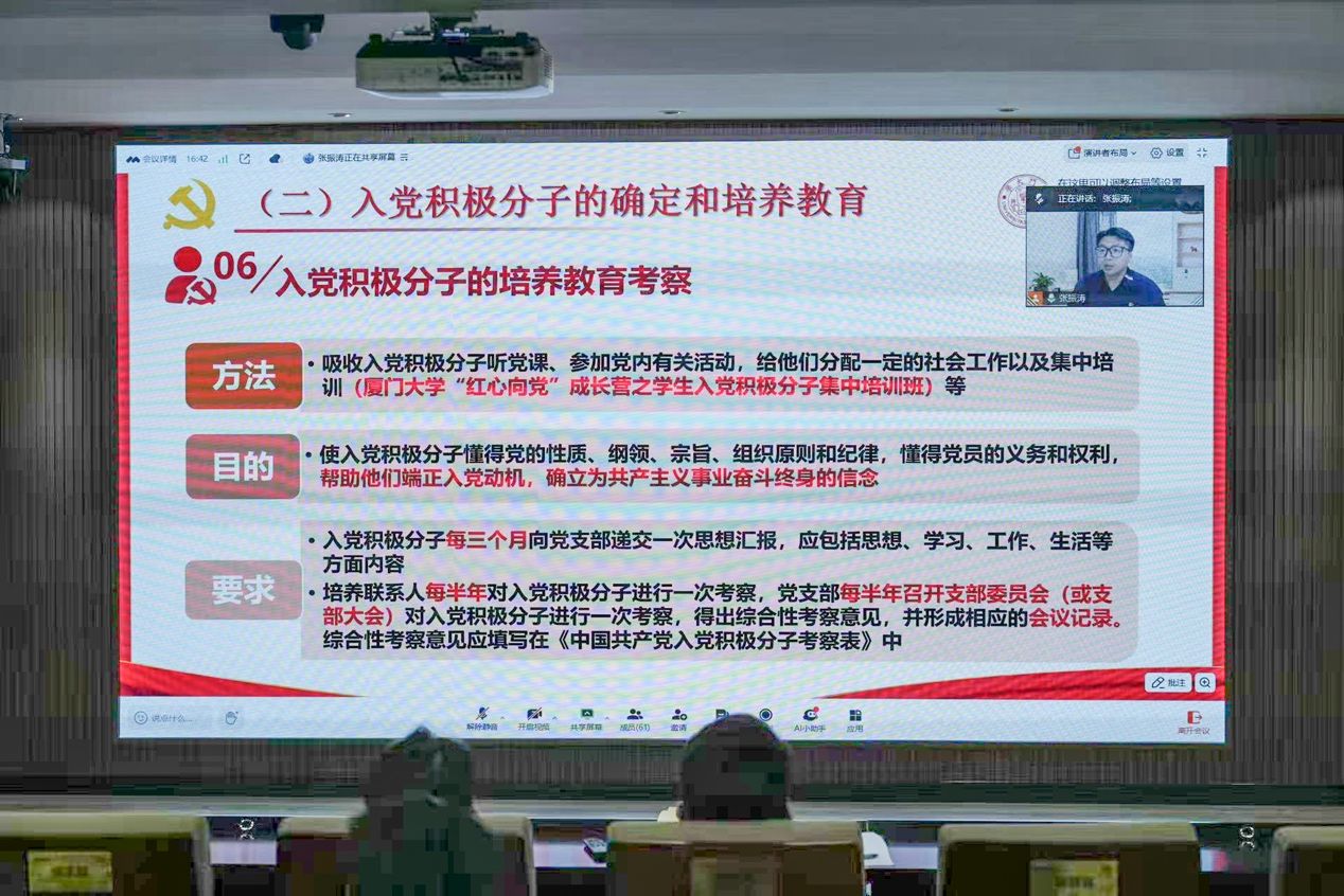 4月21日下午,厦门大学党委组织部/党建办张振涛带来“用好‘三字诀’,提升发展党员工作的‘基本功’”的专题培训,详细阐述了发展党员工作的关键要点和操作技巧,帮助学员们进一步掌握了发展党员工作的规范流程,提升了业务能力。在经验分享环节,厦门大学“研究生样板党支部”——生命科学学院植物学二班党支部书记钟君如和第五期“扬才班”学员、马克思主义学院2022级硕士研究生第一党支部书记刘思明结合本支部工作成效进行了经验交流分享。他们分别从不同角度介绍了各自支部在党建工作中的创新举措、实践经验以及取得的显著成效,为广大学生党支部提供了可借鉴、可推广的优秀范例。