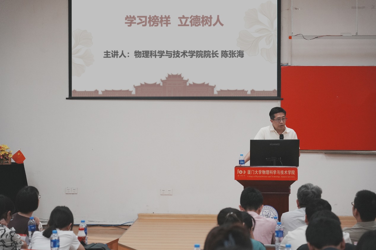 陈张海院长以“学习榜样,立德树人”为题,讲授师德师风思政专题党课,以厦门大学校主陈嘉庚先生对师资的重视为引入,讲述了萨本栋、谢玉铭、谢希德等厦大物理百年来涌现的“大先生”的故事,塑造榜样力量。同时也回顾学院通过采写编撰《百年树人》等学科百年书籍、拍摄制作师者系列视频、编排制作大思政课汇演及传承仪式等形式,切实强化落实师德师风建设和立德树人根本任务。
