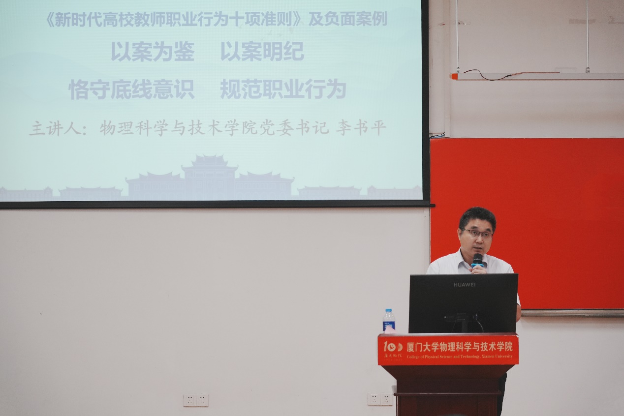 百年大计,教育为本。此次师德师风专题教育大会,以深入浅出的丰富内容,为学院教师提供一次思想教育与精神引领。学院第一时间学习《厦门大学贯彻落实〈普通高等学校教师党建和思想政治工作质量标准(试行)〉的实施方案》和《厦门大学关于进一步压实院(系)师德师风建设主体责任的实施办法》,召开师德师风建设工作专题会,部署教师思想政治建设、师德师风建设工作。近年来,我院持续开展“院长谈准则”“书记亮警示”活动,并组织多样化、多平台、多层次的师德师风教育工作。后续学院将继续扎实推进师德师风建设,通过“双周政治理论学习”“固定党日+”等活动,持续开展教师思想政治学习和师德学习教育,营造教书育人、风清气正的良好环境,激励广大教师自觉践行师德规范。大力弘扬教育家精神,打造高素质人才培养团队;合力推进一流物理学科建设,勇担强国建设使命。