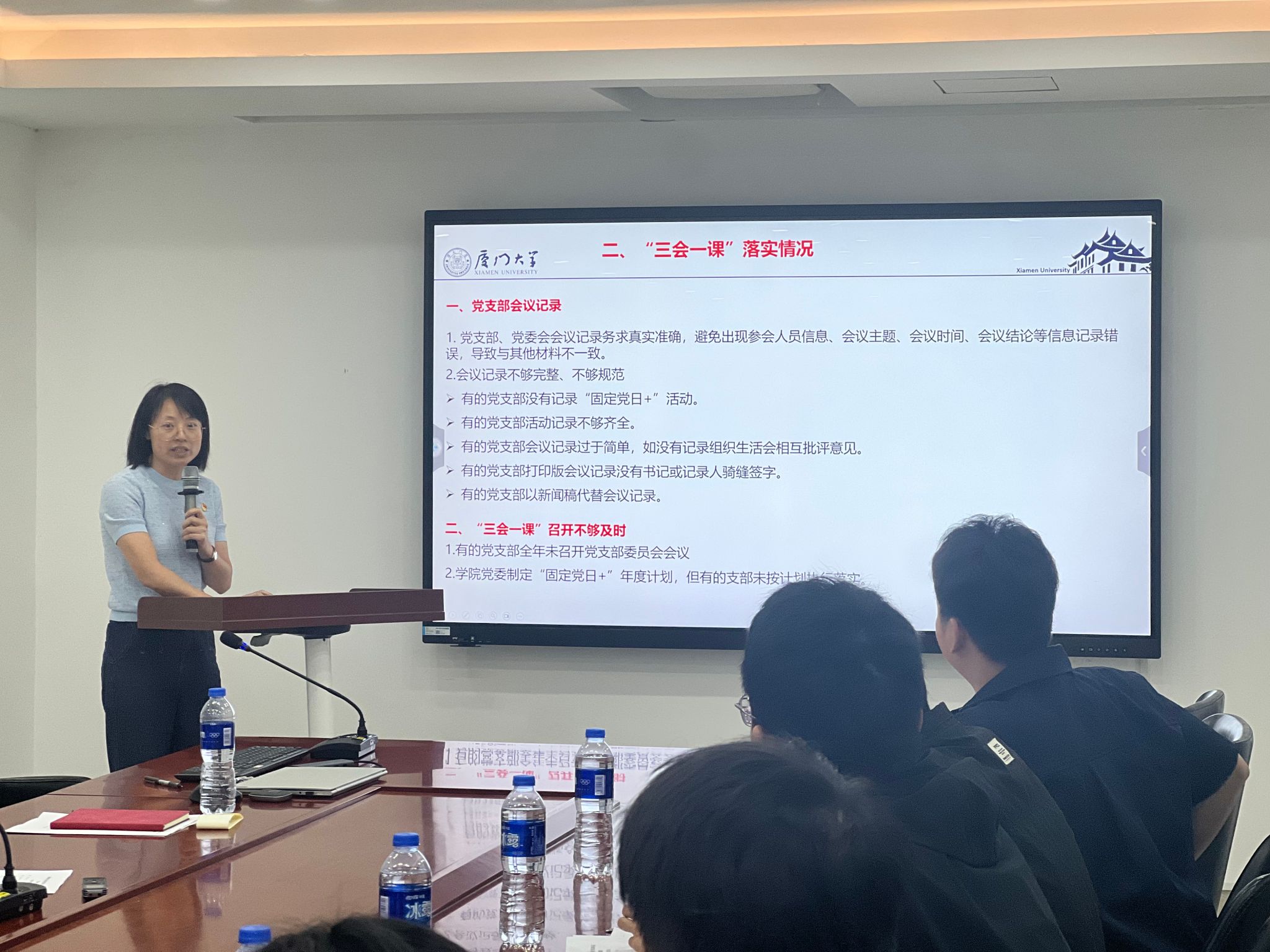 张华英首先讲解了支部全年工作要点、“三会一课”、组织生活会、固定党日活动等,并强调了会议记录的重要性;其次进行了“党员e家”平台和“厦门大学党员与干部管理教育系统”管理维护培训,介绍了常见问题与解决措施,重点需要注意党员管理和党籍与组织关系两大板块,做到底数清,数据实。