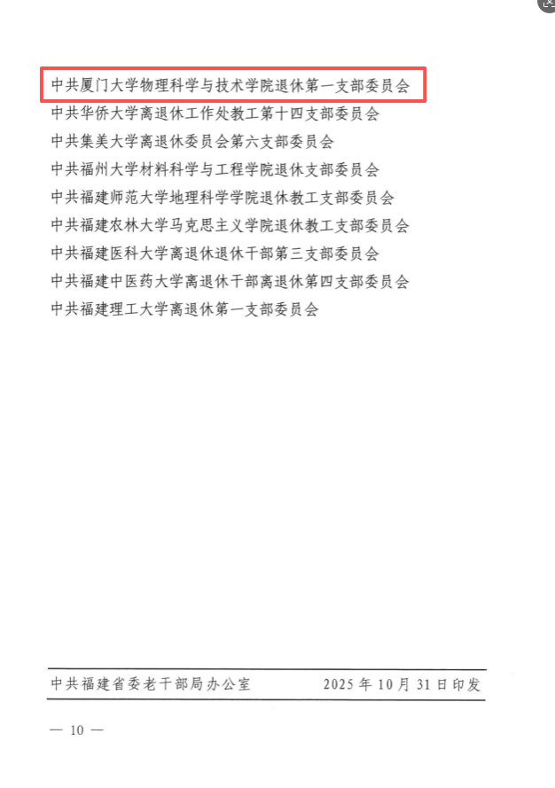 近日,福建省第三批 “离退休干部‘六好’示范党支部” 评选结果正式公布,厦门大学物理科学与技术学院退休第一党支部凭借扎实的组织建设、鲜明的工作特色与突出的服务成效,在众多参评对象中脱颖而出,荣获此项省级荣誉称号,为学院党建工作再添光彩!