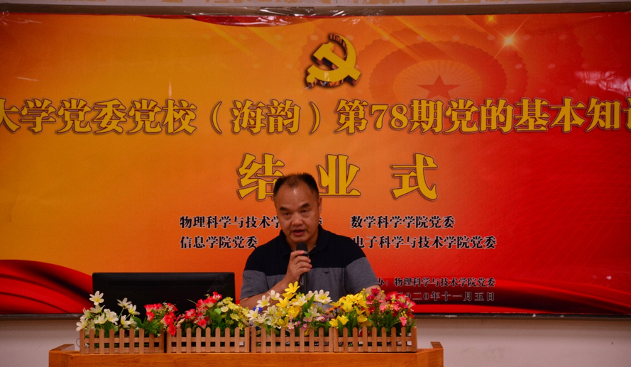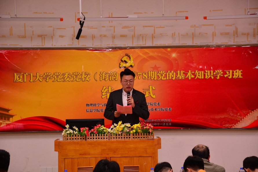 2020年11月5日下午四点半,厦门大学党委党校(海韵)第78期党的基本知识学习班结业仪式在物理大楼117教室成功举行,数学科学学院党委副书记陈国强、信息学院党委副书记龙坚毅、物理科学与技术学院党委副书记郑诚明以及各学院带队老师、本期党校学员参加结业式。结业式由物理科学与技术学院党委秘书黄涵主持。