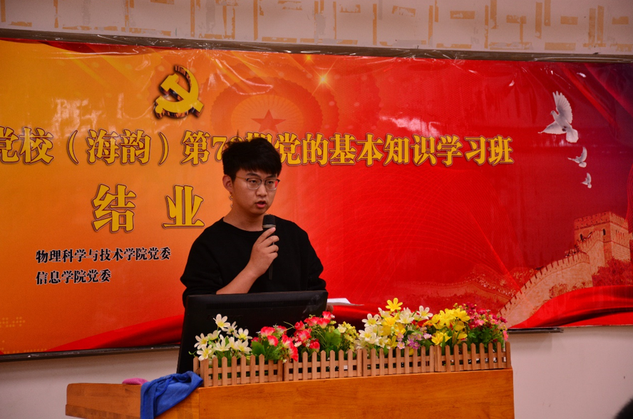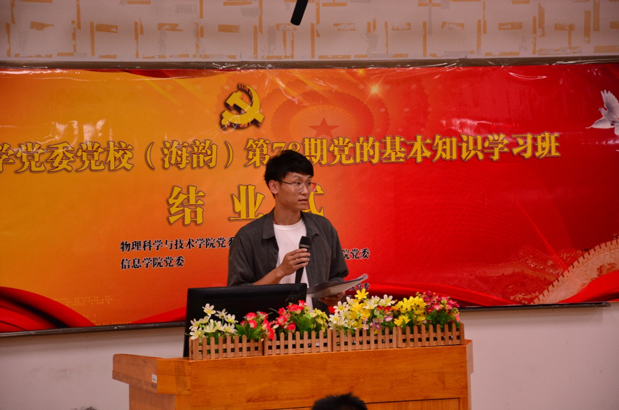 物理科学与技术学院党委副书记郑诚明老师做总结讲话。郑老师首先向圆满完成各项学习任务、顺利结业的同学们表示衷心祝贺,同时也向为学习班付出辛勤劳动的任课老师、带队老师和工作人员表示感谢。郑老师指出,本期学习班以学习党的十九大精神和党的基本知识为主要内容,顺利通过专题报告、小组讨论、结业考试、撰写论文、心得体会等形式,系统地进行了党的基本理论、基本路线、基本纲领、基本知识的培训以及党的优良传统和作风的教育。同学们都非常珍惜这次学习机会,都能以饱满的热情投入到学习中来,能够静下心来学习党的基本理论和基本知识。
