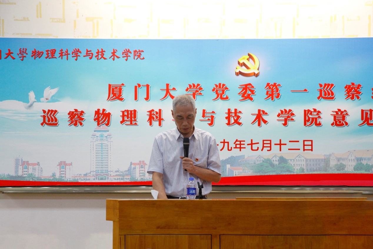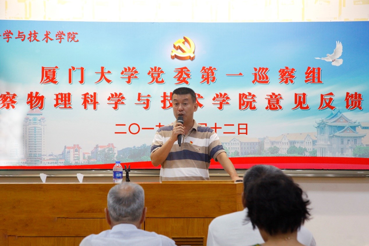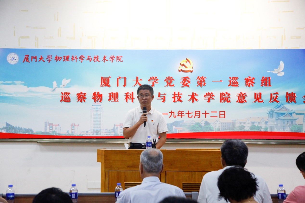 7月12日下午,厦门大学党委第一巡察组巡察物理科学与技术学院党委意见反馈会在物理大楼117报告厅召开。校第一巡察组组长、校党委委员、校工会常务副主席叶鹏飞同志,副组长、管理学院党委原副书记黄定基同志,校党委巡察工作领导小组办公室副主任洪真裁同志,联络员林志伟同志出席了会议。大会由物理科学与技术学院党委书记林奋强主持,物理科学与技术学院、萨本栋微米纳米科学技术研究院党政领导班子成员,全体教职工及离退休同志代表共100多人参加了会议。会前,厦门大学党委第一巡察组组长向我院党政主要负责同志反馈了巡察情况,学院党政主要负责同志签收了反馈意见。