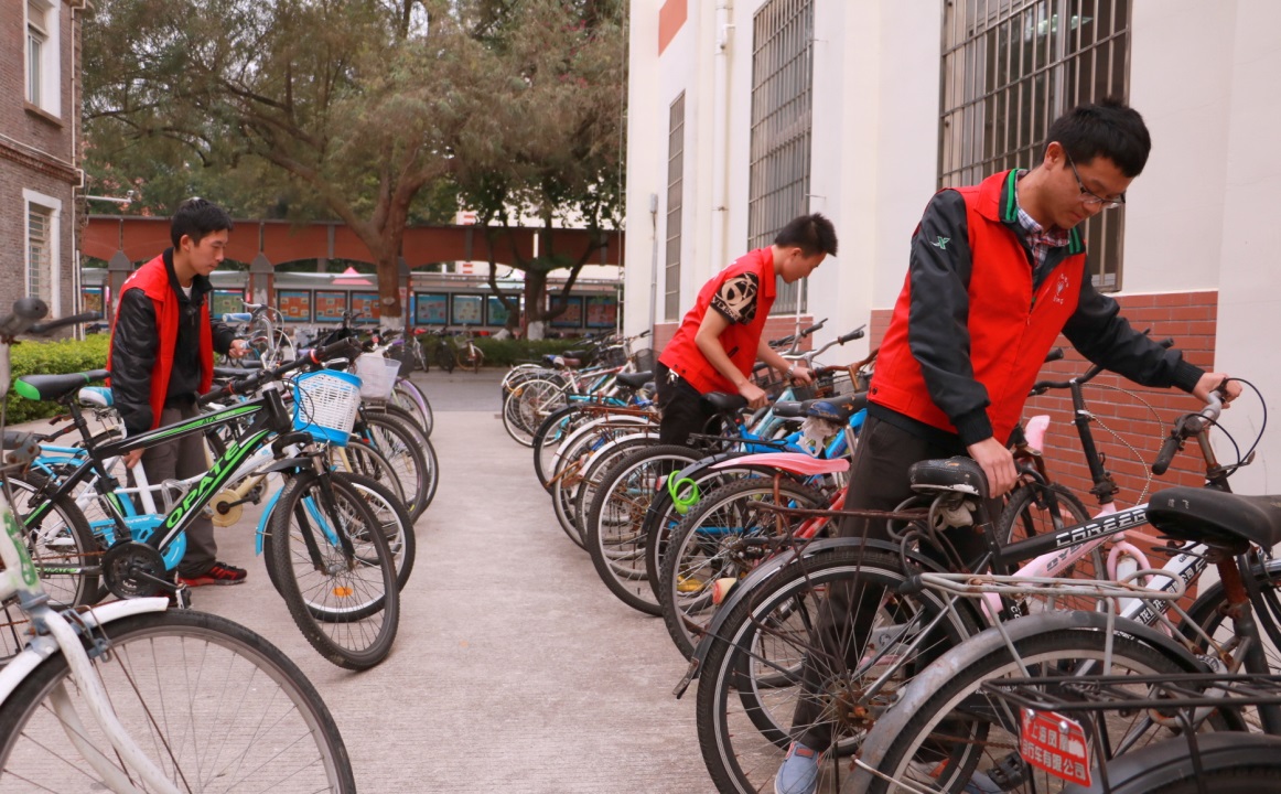 第二个任务是帮助同学们整理自行车、引导同学们规范停车。活动过程中,看到横七竖八的自行车,我们的志愿者立刻投入工作。他们按照停放顺序不断搬运、扶起自行车,把原本凌乱的自行车方阵变得整齐有序。志愿者每次搬完自行车后,总会细心地把重新整理自行车的后支撑架,这样可以使自行车站立的更加稳当、防止自行车再次倒下。虽然这只是一个小小的动作,