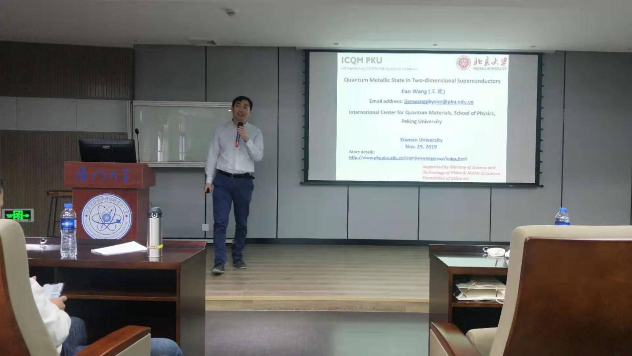 2019年11月29日下午,北京大学王健教授应我院陈张海教授的邀请在海韵园校区物理楼552报告厅作物理前沿系列学术报告,报告会由物理学系主任蔡伟伟教授主持,报告会主题为“Quantum Griffiths singularity, quantum metallic states and Ising superconductivity in 2D Superconductors“。物理科学与技术学院相关老师和部分研究生、本科生聆听了讲座。