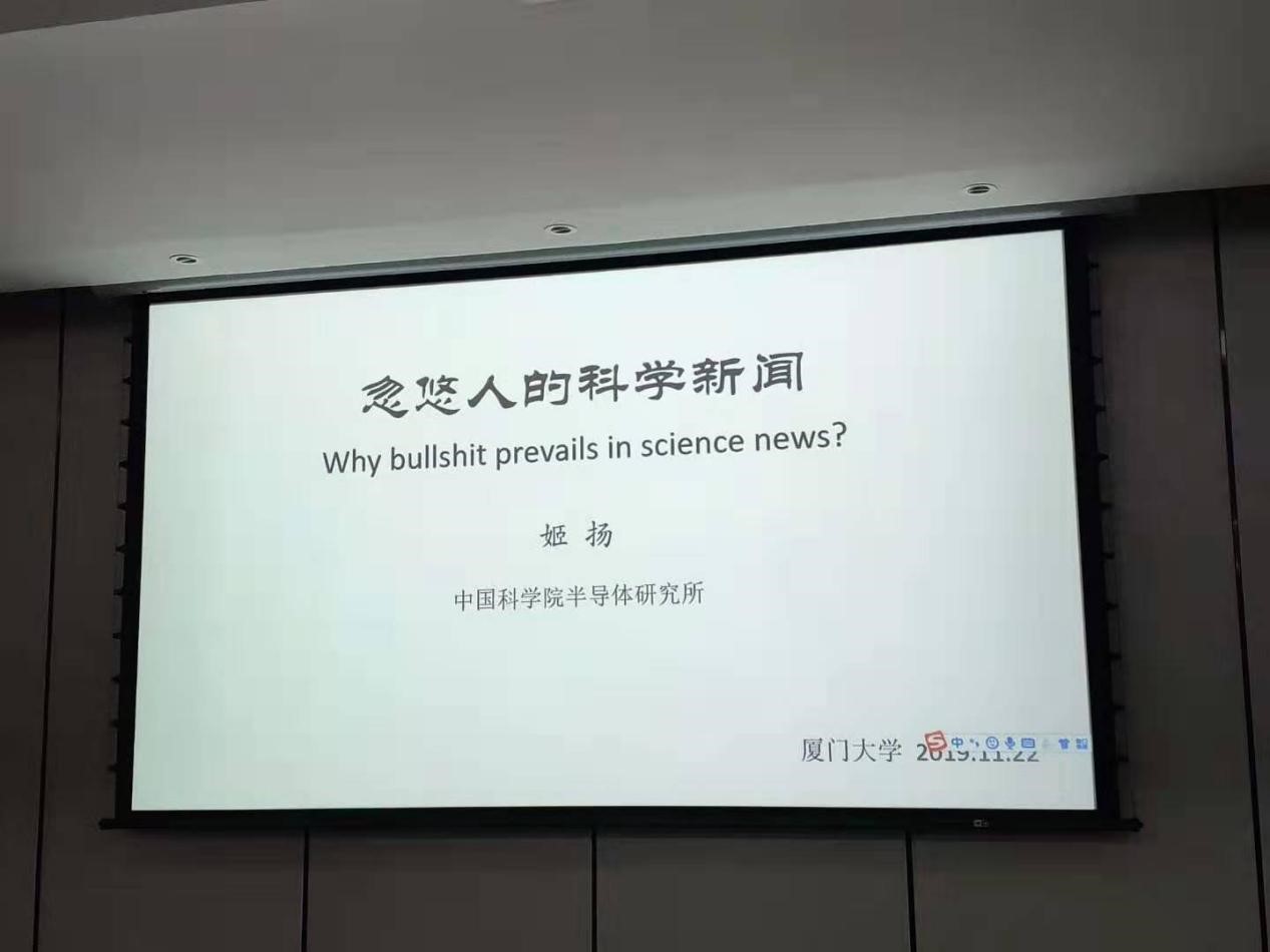 应厦大物理科学与技术学院陈张海教授的邀请,中国科学院半导体研究所姬扬研究员于2019年11月22日在物理楼552报告厅为我院师生做了题为“忽悠人的科学新闻”的物理学前沿讲座。报告会由吴志明教授主持,物理学系近百名师生参加了本次学术报告。