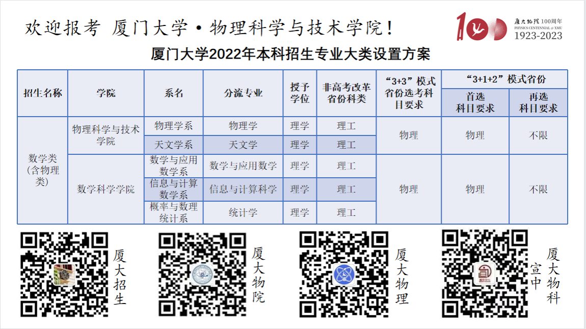 万物之理,强国之基。厦门大学物理科学与技术学院不仅拥有近百年历史的物理学专业,也有神秘浪漫的天文学专业。近年来,在国家“211工程”、“985工程”及“双一流”建设支持下,学院已经逐步形成了理论物理、凝聚态物理、半导体物理、软物质物理、光学和多信使天体物理等六大重点学科方向。现有10余个国家级、省部级、校级科研教学平台,获评物理学博士后流动站、物理学一级学科博士点、天文学一级学科硕士点,凝聚态物理国家重点学科等。在这里你可以仰望星空,脚踏实地,在五老峰下、珍珠湾畔开启人生新篇章。