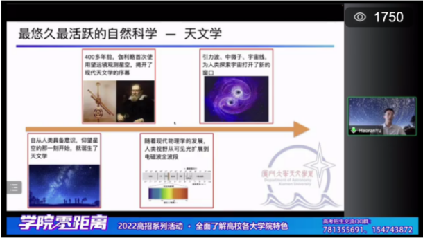 “人类是如何仰望星空的?”“什么是两暗、一黑、三起源?”于浩然教授通过通俗的语言向观众展示了天文学的科普知识和前沿研究动态,并向考生介绍了现代天文系及天文学专业的学习内容,他表示我国天文学已进入高速发展时期,厦门大学天文学系拥有悠久的历史、一流的师资及丰富的科研资源,高质量人才培养模式也源源不断地为社会输出天文学研究和工作专门人才,他也希望未来有更多对天文有兴趣的考生加入厦大天文。