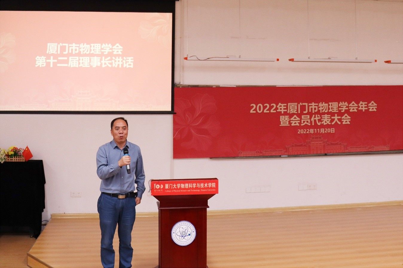 在热烈的掌声中,连任物理学会第十二届理事长的杨志林教授上台讲话。杨志林教授对厦门市民政局、科协与厦门大学物理科学与技术学院对厦门市物理学会工作的支持、学会会员对他的信任表示衷心感谢。他简要介绍学会未来的工作要点,希望在全体会员的共同努力下,继续办好学会,推动厦门市物理学科及相关行业发展。