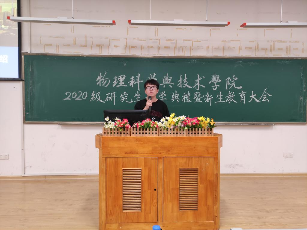 物理院副院长顾为民老师为新生们的入学教育致辞,提出了几点建议,首先,安全是重中之重,要重视安全问题,在进行实验工作以及出行的时候要特别注意安全,避免遭受不必要的风险。其次,在学习方面,要以科研为重,明确研究生是科研的主力,要把主要的经历放在科研上。此外要主动积极的与导师沟通交流,提出自己的科研想法、学习工作的规划或者是科研中遇到的问题,有问题及时解决,这样才能更快的出成果。最后,要有团队意识,不论是对于学院还是课题组,都要有团队精神,要重视团队合作。