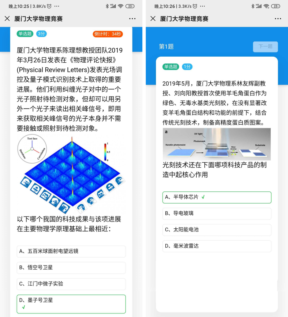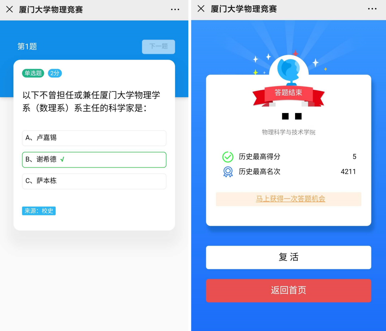 作为传统的物理强校,厦大物理的发展史与厦门大学的校史始终交织。在百年校庆到来之际,以厦门大学的物理学史为切入点,在学业竞赛中渗透“课堂思政”教学理念,也是本届竞赛平台提供的又一个的尝试点。通过题目,在赛中学,同学更加了解了厦大的历史底蕴,为庆祝校庆做了铺垫。参赛同学对这一形式非常欢迎,一位同学这样说到:我曾经去过厦大在长汀的校园,那里现在已经成了厦门大学校史馆的一部分,里面还收藏着一些厦大教师当时自编的《大学物理》《大学物理实验》等书籍。厦大物理系历史悠久,建系以来有谢希德、上官世盘等杰出校友从数理系毕业,物理系目前还设有“纪念谢希德奖学金”、“78物理系校友奖学金”等勉励现有物理系学子认真学习。此外,还设计了一部分关于我校物理创新研究成果的题目,为本科生同学了解学术前沿提供了一个喜闻乐见的媒介。