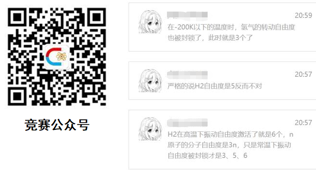 本届网络竞赛,还特别设立了“物理知识竞赛”(xmphyc)公众号,并通过答题政策引导同学关注公众号。竞赛相关通知,除在教务处网站及教务处微信号上推送外,在竞赛公众号上发布。同时竞赛公众号也是参赛者向组委会赛制咨询的主要管道。同时还成为了物理讨论的平台。如针对一道气体自由度的题目,同学发表了以下看法。组委会采纳了他的意见,提高了题目的严谨性。还从一部分学院的参赛者中遴选了学院联络人。作为辅助措施,成为联系到参赛者个人以及发动学院参赛的有效补充机制。