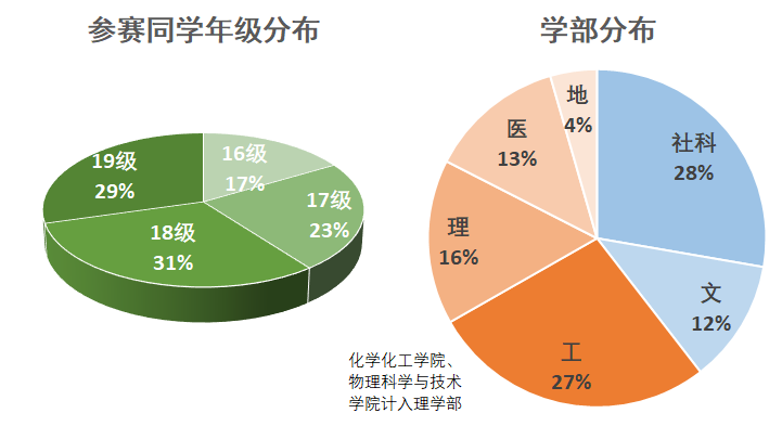 从参赛同学年级分布来看,参赛主力确为大一大二,但是大四仍占全部学生有17%的参赛份额,这点是较为惊喜的。更为惊喜的是,文科院系参与度高。按照学部统计的参赛者分布来看,社科学部与文学部院系累计共占全部参赛者的42%,撑起了半壁江山。采访了部分文科同学,有一位管理学院的同学这样说道:“物理与生活息息相关,在电影《星际穿越》中也有关于时间扭曲、黑洞、引力波的物理学知识。从物理学史上的两朵乌云,到人类首张黑洞照片的公布,这期间有无数的争论,也是对真理的不断追求。虽然我现在所学的学科已经与物理没有关系了,但是作为曾经的理科生,学习物理时让我形成了缜密的逻辑思维和客观看待分析各种现象的能力,这将是终身受益的。”另一位同学转系到国际关系学院的同学曾经学过大学物理,他说“关于大学物理也许在一些具体问题上的帮助不大,但是学习了两年的理科思维可能让我在分析政治问题时更客观,冷静,没有那么多的意识形态偏见。”