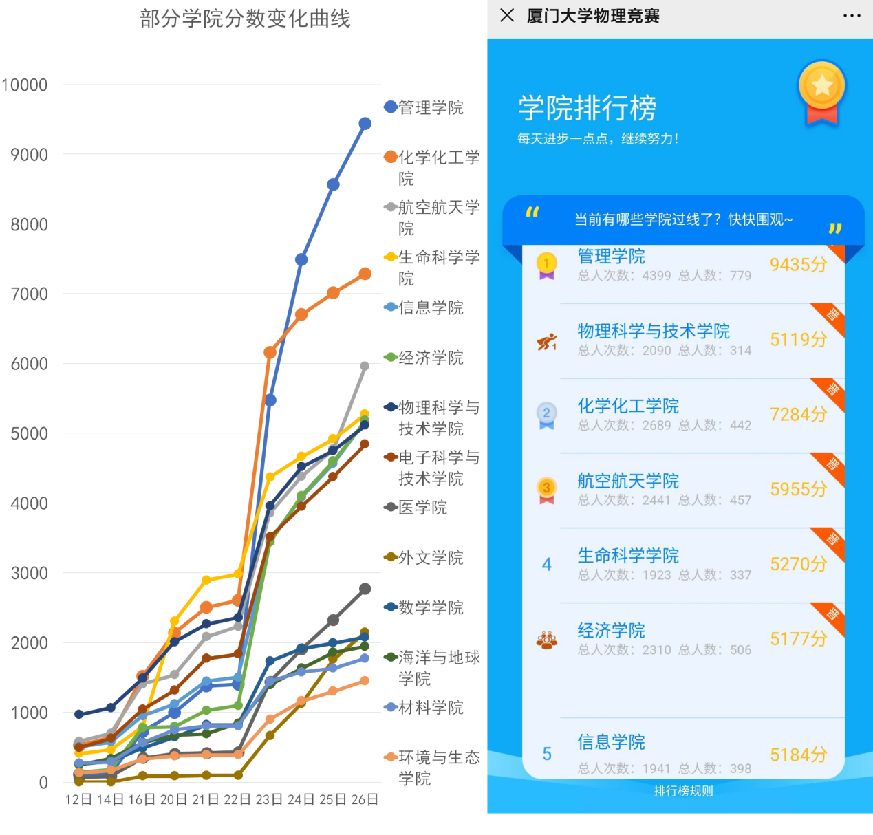 在这次网络竞赛中,晋级学院的争夺是另一大看点。学院成绩由所在学院所有同学的最高分加和而来。学院成绩排名实时公布机制就对同学的集体荣誉感产生了直接的激励作用。在这一感召下,本院同学纷纷组织起来为集体的荣誉而战。出乎预料的是,占据团队总分第一位置的学院除在比赛的初始阶段是物理科学与技术学院,更迭多次,竞争激烈。生命科学学院、化学化工学院都曾抢占总分第一,第一阶段最终暂列总分第一的为管理学院。而根据赛制规则设计,经济学院依据参赛人次数多,力压总分较高的信息学院暂时进入晋级线。