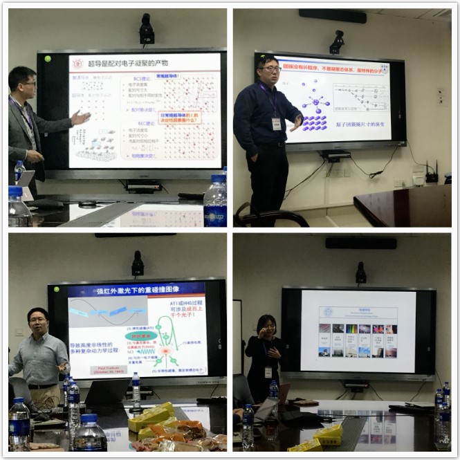 本次学术论坛共做4场学术报告。来自上海交通大学物理与天文学院的刘灿华分享了在超导领域的前沿科研动态《Phase stiffness dominated superconductivity in FsSe ultrathin films on SiTi03 film》、来自南京大学物理学院的宋凤麟分享了最新团簇研究成果——《团簇研究走向原子制造》,来自北京大学物理学院的彭良友做题为《强场与阿秒物理》的学术报告、来自中国科学技术大学近代物理系的彭新华则对量子计算进行了生动的科普——《计算的量子飞跃——漫谈量子信息科学》。为本次论坛带来了一场知识盛宴。报告新颖有趣,引起了师生们的广泛讨论和积极提问。