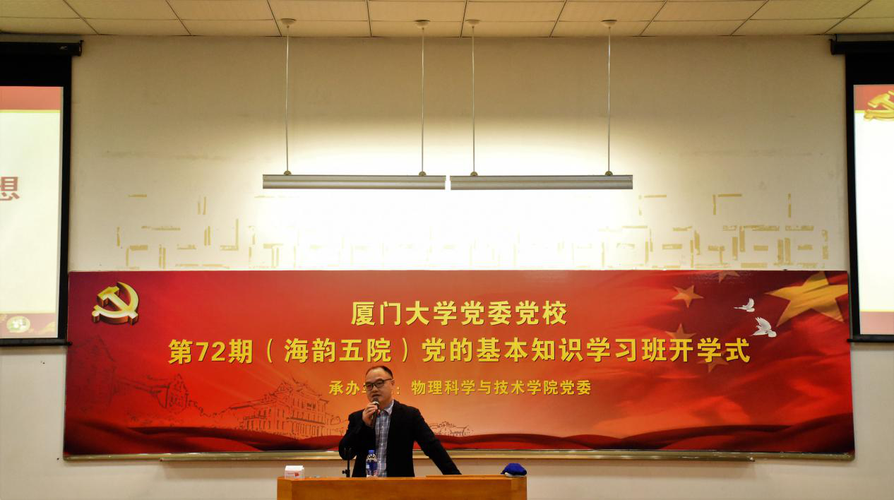 2019年3月23日上午,厦门大学党委党校第72期(海韵五院)党的基本知识学习班开学式在海韵园物理大楼117报告厅隆重举行。本期学习班由物理科学与技术学院、数学科学学院、信息科学与技术学院、软件学院和电子科学与技术学院五个单位党委联合举办,由物理科学与技术学院党委承办。物理科学与技术学院党委副书记郑诚明、信息科学与技术学院党委副书记杨蔷、软件学院党委副书记史亮、电子科学与技术学院党委副书记方银水、数学科学学院党务秘书曹璐老师;本期党校带队老师和128名入党积极分子出席了开学式。