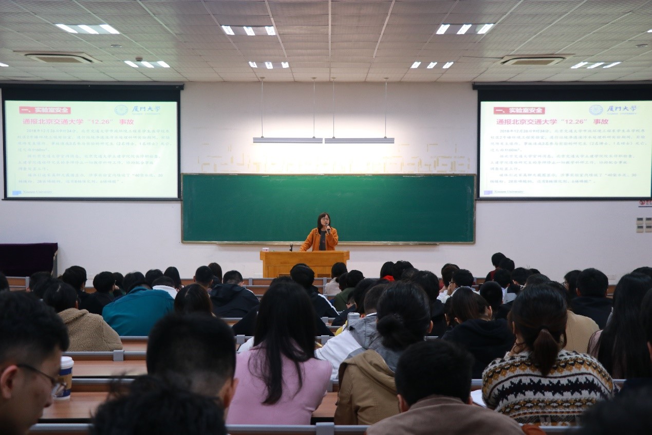 会上,全体师生共同观看了一段实验室安全宣传片。随后,邱老师从全国高校学生安全事例谈起,强调了研究生安全工作的重要性,以及加强实验室日常管理中指出了药品摆放、气体存放和排插用电不规范等问题。为营造平安和规范的校园氛围,会议中邱老师还从工作室安全、宿舍安全、人身安全、财产安全、游泳安全、台风防范和文明用网等多方面对学生进行了安全解读。