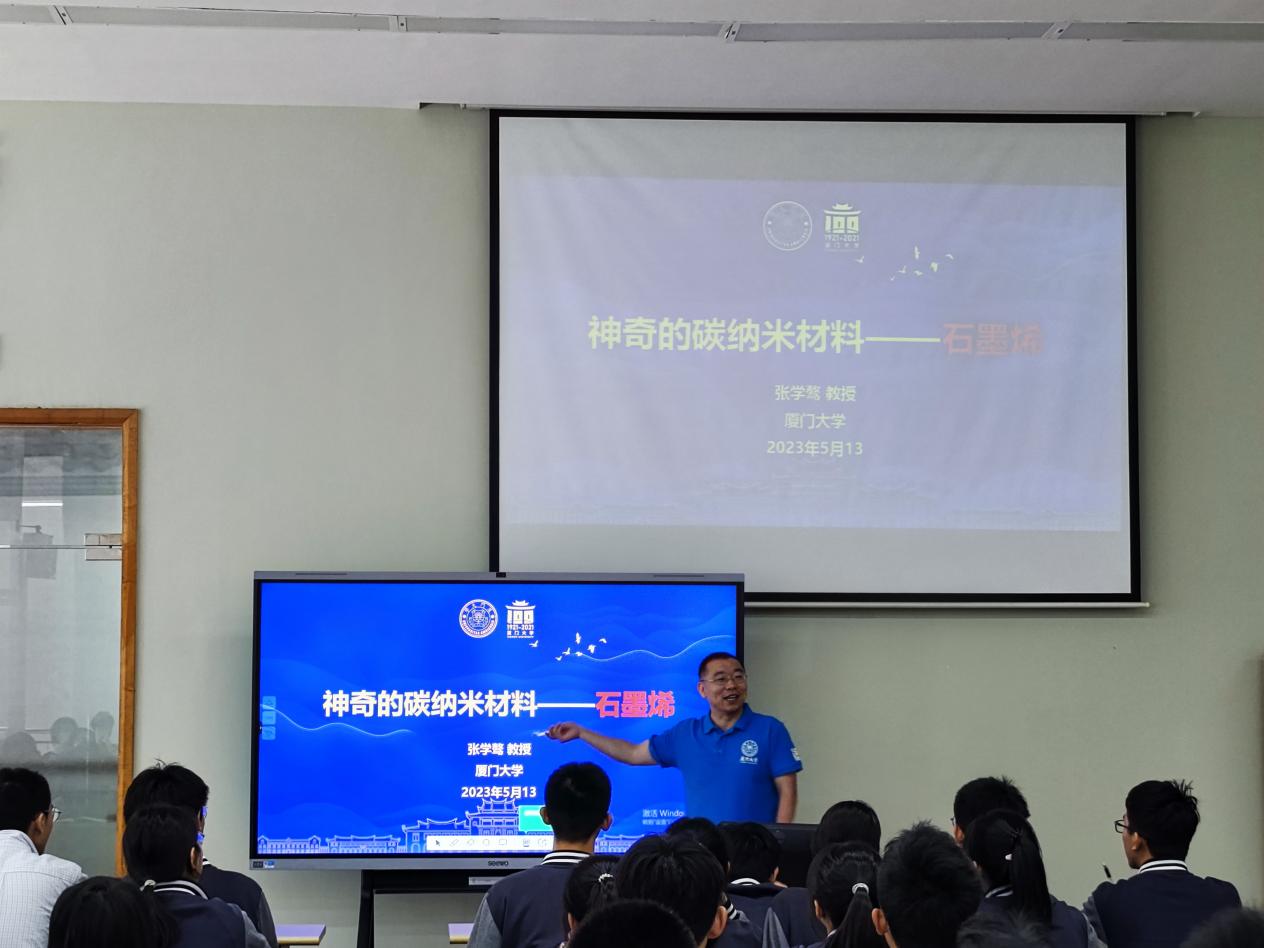 张学骜教授开展了主题为“神奇的碳纳米材料-石墨烯”的学术科普讲座。讲座从实际生活角度切入,介绍石墨烯的发现、表征、制备和性质等,带领同学们走进石墨烯的世界,也展示了厦门大学的科研工作,激发了他们对物理的兴趣和对科研的热情。