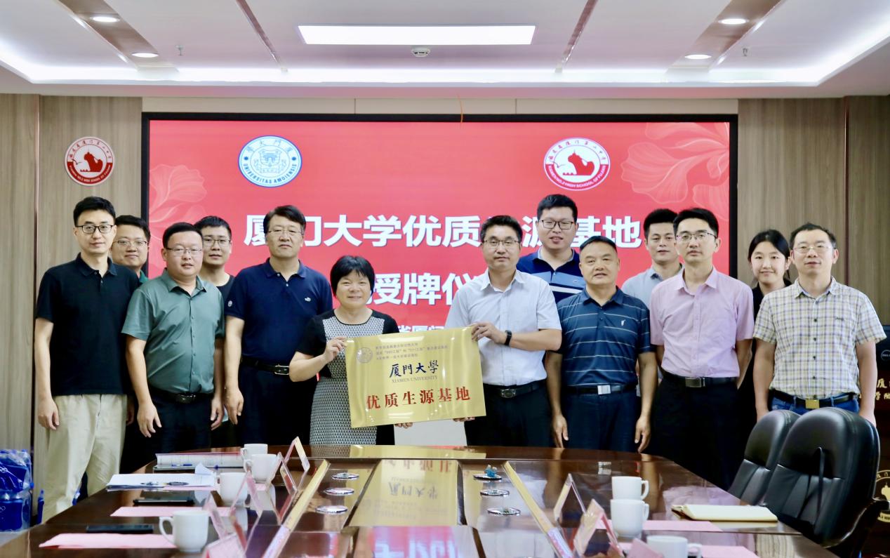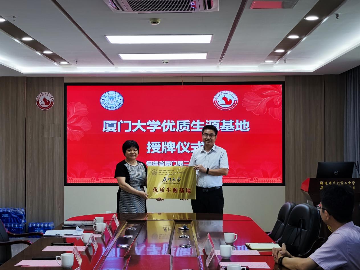 厦门二中校长王守琼介绍了学校的基本情况,并带领厦门大学招生组成员参观了厦门二中的校史馆、足球馆,并进行了一一介绍,让厦门大学老师了解了厦门二中的光荣历史和办学特色。在座谈交流会上,李书平重点介绍了厦门大学发展历程、招生政策、招生情况等内容。双方就加强合作、提升办学质量、培养高质量人才进行了交流并达成共识。期望未来双方能有更多交流、合作,助力培养更多优秀人才。会后,李书平书记代表厦门大学向厦门二中颁发了“厦门大学优质生源基地”牌匾。