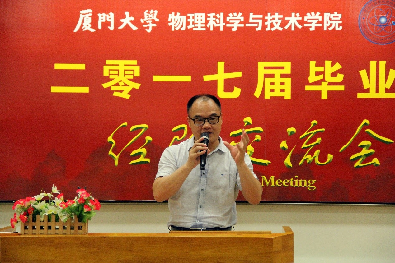 2017年5月10日,我院2017届毕业生经验交流会在物理大楼117会议室隆重举行。出席本次大会的嘉宾有物理科学与技术学院党委副书记郑诚明老师、团委书记邱荣锋老师、团委副书记陈洪老师。本次大会邀请了章杨、杨奇志、沈培鑫、任靖宇、蓝天、江迎、黄家铭、胡靖敏、郝月、方一奇、闫志朔等十一位2017届优秀毕业生,与低年级同学分享出国、考研、保研、就业、支教等经验。