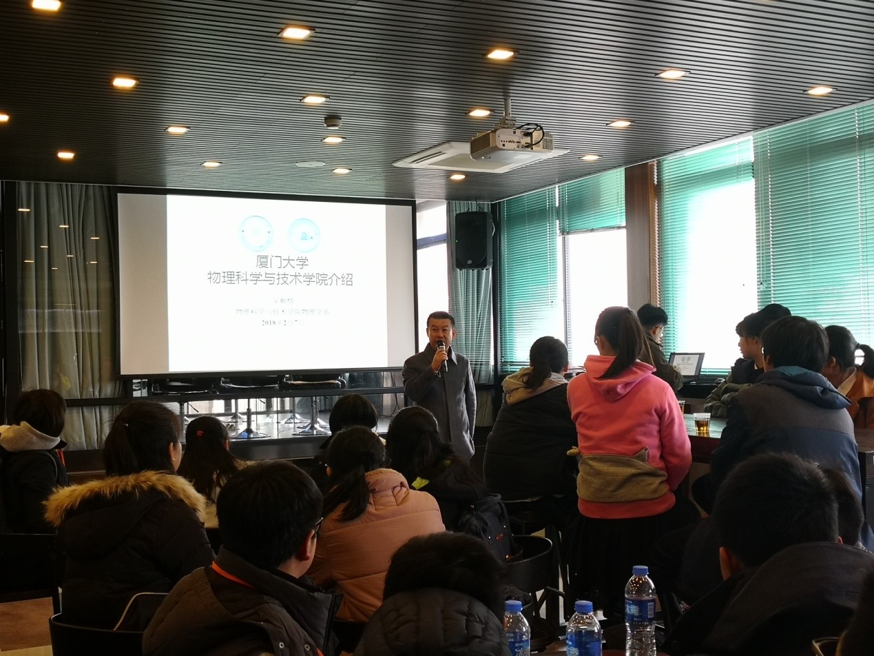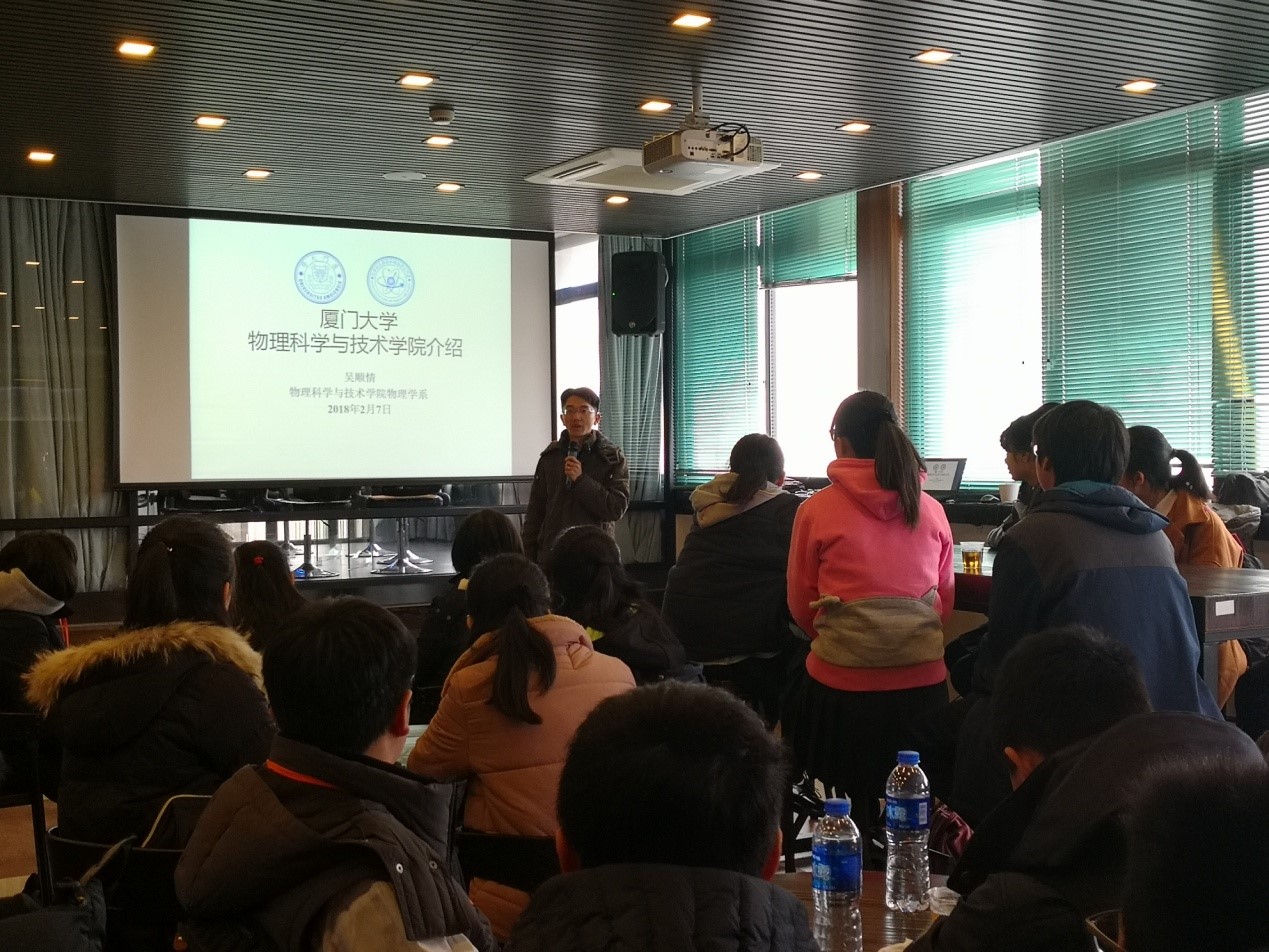 紧接着,吴顺情教授对我院学科的整体构架、师资情况、研究方向进行了介绍。学院分为物理、天文两大系别,各系师资力量雄厚,有诸多杰青、优青学者,他们都直接参与一线教学工作。学院学术氛围浓厚,学术教学资源丰富、学科平台广阔。学院半导体、凝聚态等方向都已入选“双一流”项目。蔡伟伟教授在石墨烯领域、陈理想教授在量子光学方向的科研成果也都在相应领域产生重要影响,获得诸多奖项。吴老师还介绍了学院人才培养方面的做法。我们的本科教育实行基础学科“拔尖计划”,筛选有志于从事物理专业科研的学生进行重点培养,同时,还推行了“双一流”人才建设,开设“第二课堂”,全面提升本科生的综合素养。此外,学院还对中学生素质拓展工作投入了不少的时间精力,通过开展素质拓展营、物理奥赛、英才计划等活动,提高中学生对基础学科的兴趣,挖掘相关人才。在吴顺情教授耐心详细的介绍下,同学们对物理科学与技术学院、对物理学科都有了更全面的认识和了解。