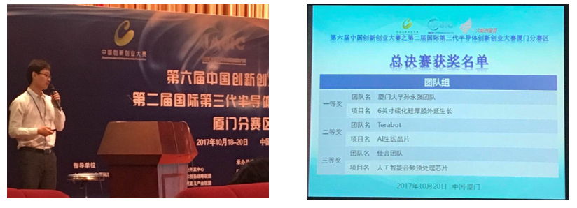 2017年10月18日至20日,第二届国际第三代半导体创新创业大赛(厦门赛区)在福建厦门举行。经过三天的激烈比赛,我院孙永强等同学组成“厦门大学孙永强团队”,凭借“6英寸碳化硅厚膜外延生长”项目在100多个参赛项目中脱颖而出,获得团队组第一名,并获得晋级全球总决赛的宝贵机会。第二届国际第三代半导体创新创业全球总决赛于2017年10月29日至11月1日在北京顺义产业园举行。经过紧张激烈的复赛,本项目顺利从团队组20个项目中杀入决赛,在导师康俊勇教授的指导下,经过不断的调整和完善,最终在决赛中用优异的表现打动评委并获得第六名的好成绩。