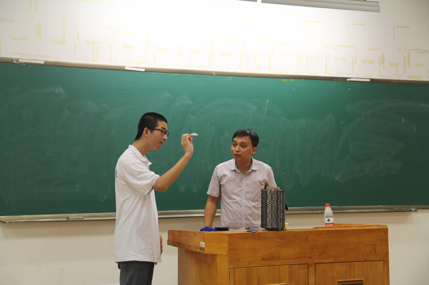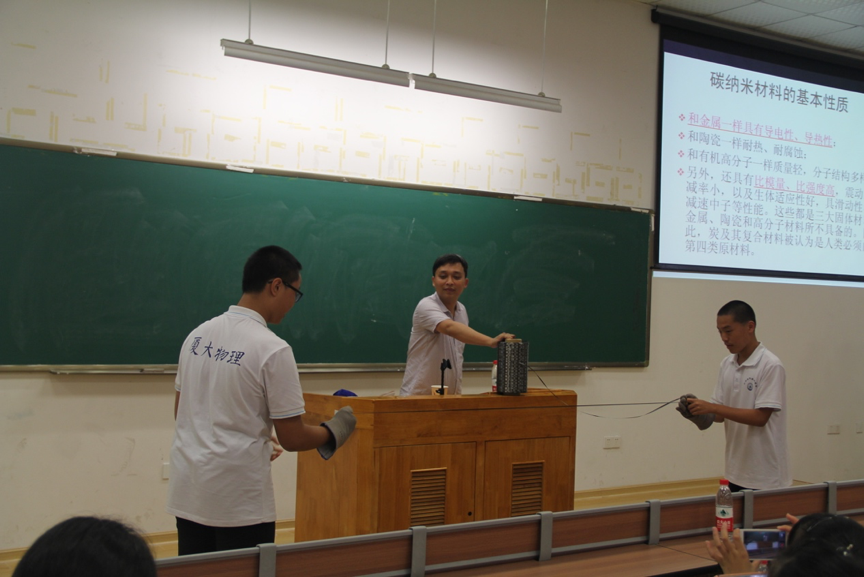 蔡教授从不同的碳材料不同的导电性和导热性入手,并引导营员们思考原因。在此期间,蔡教授多次邀请营员上台亲自感受碳材料的导热性,和同学形成了良好互动。当老师提到可以用头发丝、打火机以及敲击的声音来鉴定玉石,引起了同学们广泛的兴趣。其后,蔡教授继续为大家介绍石墨烯的特点、生产和制作设备。这节课的内容由浅入深,将物理知识提升到了新的深度和前沿,引起了同学们深思。