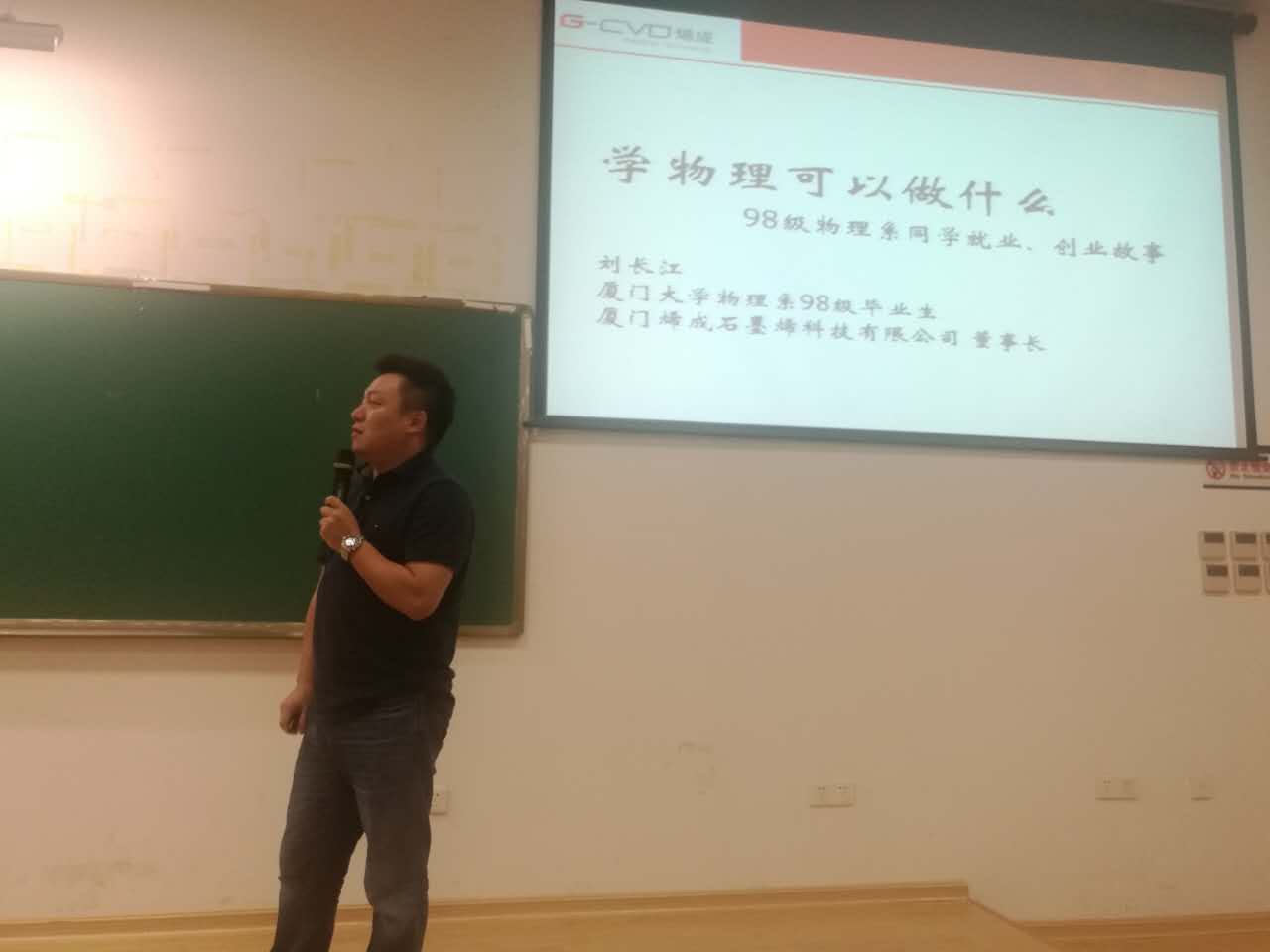 本次科普拓展营还特别邀请了优秀企业家、我院优秀校友代表、烯成石墨烯科技有限公司董事长刘长江先生。他向同学讲述了自己周边人在各个领域成功的事例,强调物理学就业面之广,前景之深。同时他简单介绍了自己所在的烯成石墨烯科技有限公司的特点和成就,传授成功的经验,向学生分享自己所坚守的“仰望星空,脚踏实地”的理念并教导学生踏实做事。对于大学生创业方面的问题,他为学生们介绍了一些基本流程,强调“对的人”以及“良好的心态”对于创业的重要性。学生们聚精会神,收获颇丰。