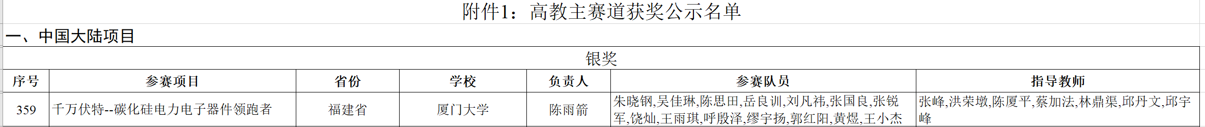 2023年12月6日,中国国际大学生创新大赛(原“互联网+”创新创业大赛)于天津顺利闭幕,我院报送的作品“千万伏特--碳化硅电力电子器件领跑者”获得本届大赛高教主赛道银奖。