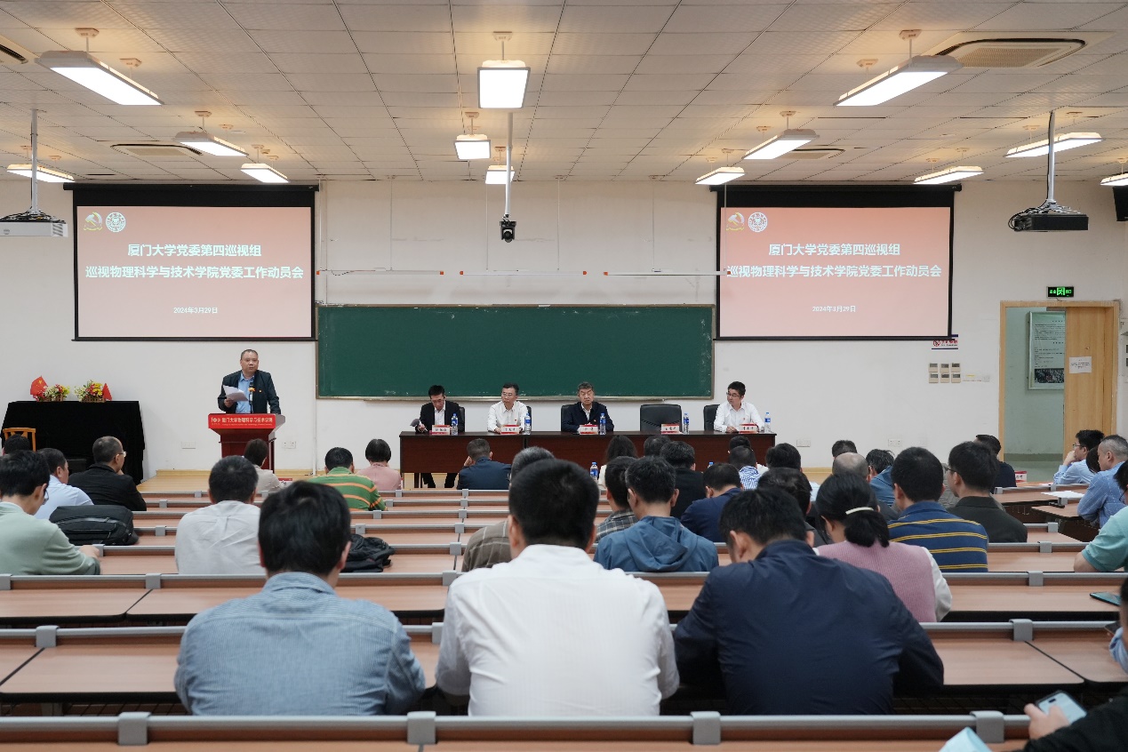 3月29日上午,校党委第四巡视组巡视物理科学与技术学院党委工作动员会在海韵校区物理大楼117报告厅顺利召开。校党委副书记、纪委书记、国家监委驻厦门大学监察专员全海,校党委第四巡视组组长王康平,副组长宋友良,巡视办主任洪真裁,第四巡视组其他组员出席动员会。物理科学与技术学院党政班子成员、在职教职工、部分担任过班子成员的退休老同志代表和学生代表参加会议。会议由学院院长陈张海主持。