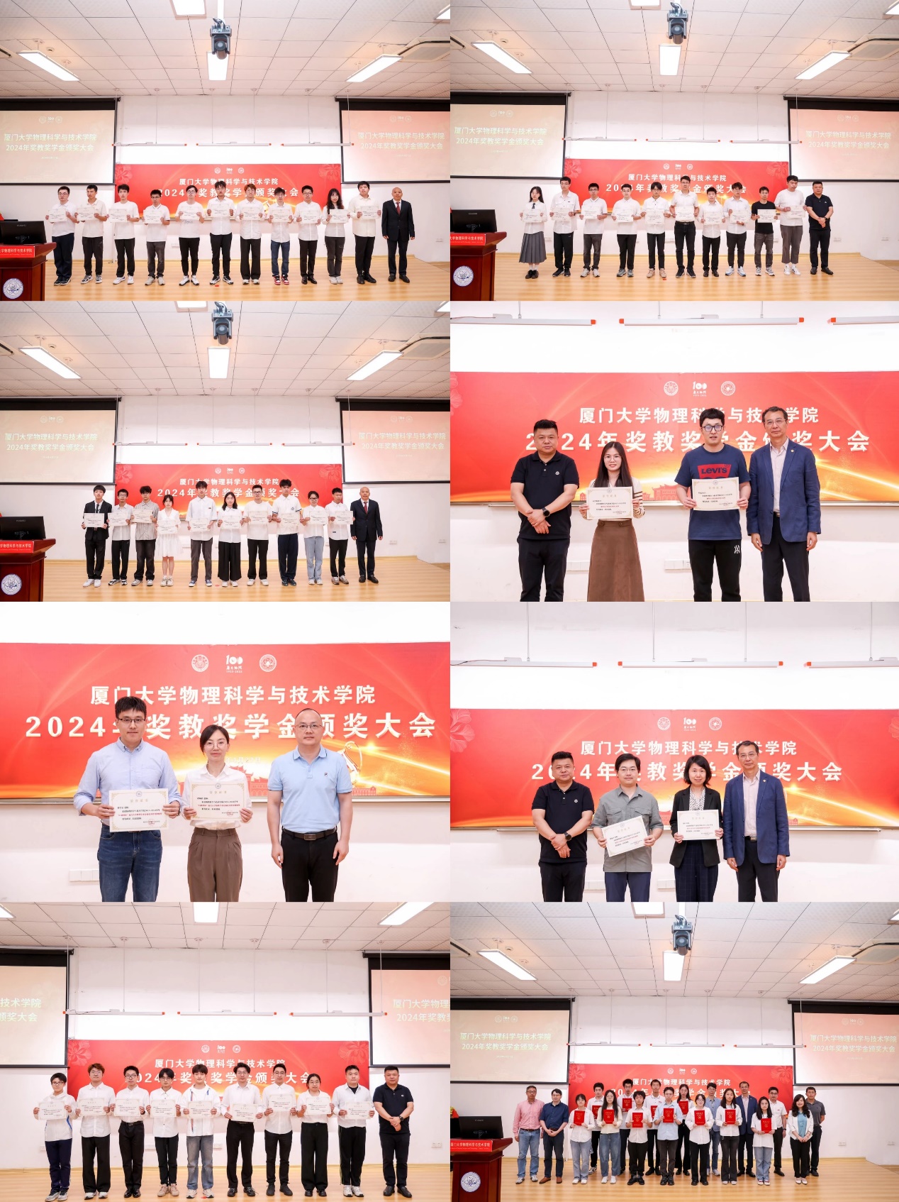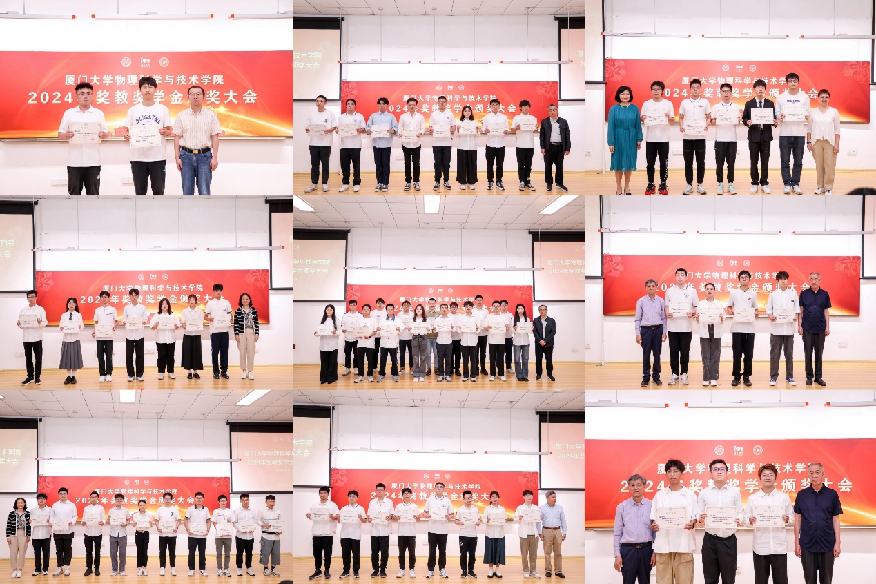 颁奖仪式上,学院为获得院级奖教奖学金的师生制作了贺信与奖状,获奖师生依此上台领奖并合影留念。2024年物理科学与技术学院共设立26项奖教金、奖学金、助学金:谢玉铭奖学金、蔡文种奖学金、86物理学友奖学金、78学友奖学金、78学友半导体物理研究奖、谢希德奖学金、陈智松拔尖人才培养基金、涂庆镇物理科创奖学金、格物致理奖学金、98物理奖学金、傅里叶物理奖学金、三达奖学金、吴伯僖卓越人才培养基金、“01物理杯”厦门大学物理学术竞赛优秀指导教师奖、德智人才基金、上海天文台光启奖学金。