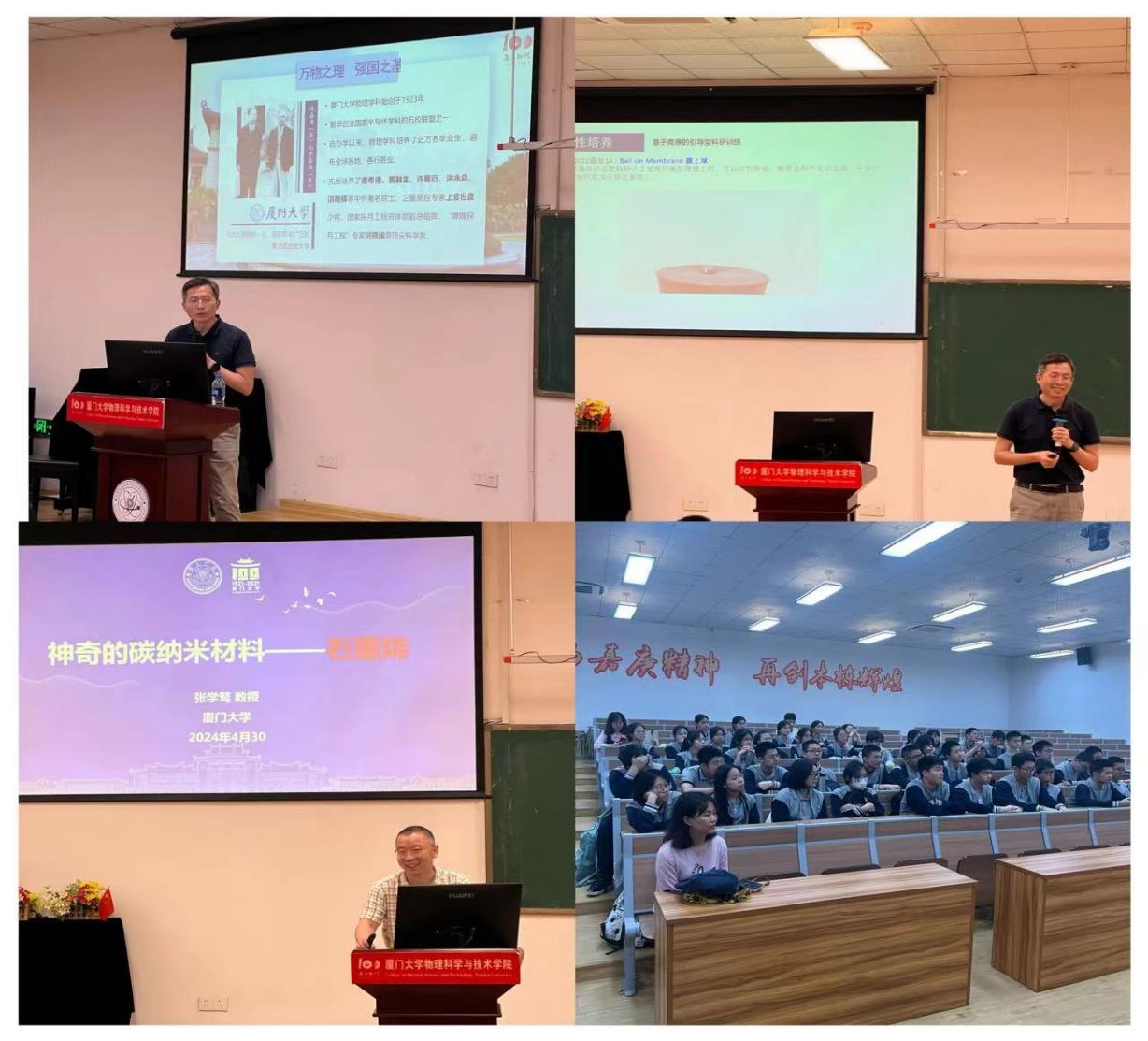 4月30日下午,厦门同安一中(滨海校区)师生应邀来访我院。我院院长助理贺达海教授向同学们进行了招生宣讲,详细介绍了我院物理学拔尖计划和强基计划培养特色,展示了我院本科生创新能力的培养成效;物理学系副主任张学骜教授给同学们开设了“神奇的碳纳米材料—石墨烯”的科普讲座,带领同学们走进石墨烯的世界,了解石墨烯的前沿研究。