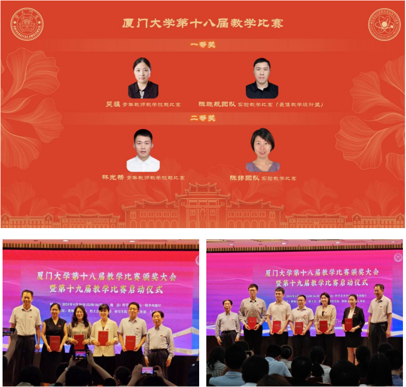 随着厦门大学第十八届教学比赛落下帷幕,2024年4月30日下午,在科学艺术中心一楼多功能厅举行了“厦门大学第十八届教学比赛颁奖暨第十九届教学比赛启动仪式”。我院在第十八届全校比赛中,获得一等奖2项、二等奖2项、最佳教学设计奖1项。其中,在第十八届青年教师教学技能比赛中,吴猛老师获一等奖,林光杨老师获二等奖;在第二届实验教学比赛中,陈晓航老师团队(陈晓航、郑暄丽、姚真瑜、孔丽晶、程唤龄)获一等奖及最佳教学设计奖,陈婷老师团队(陈婷、陈真、程唤龄)获二等奖。在此对取得优异成绩的各位老师表示热烈祝贺!