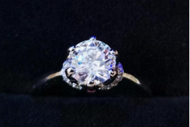 这枚“钻戒”是莫桑石做成,莫桑石是世界上最闪亮的宝石,硬度仅次于钻石,是世界上第二坚硬的宝石;它的明亮度,光泽度和火彩甚至超过了钻石。