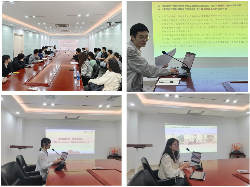 第六期“扬才班”学员、外文学院2023级硕士研究生第三党支部书记徐诺围绕党员教育管理监督工作,从党员e家、党校学时系统操作和党费收缴、支部活动的组织出发,系统讲解了学生党支部日常工作思路、内容、方法。第六期“扬才班”学员、建筑系与城市规划系研究生第三党支部书记陈玉珠介绍校党支部工作“立项活动”优秀成果二等奖项目——“爱心One by One”西部助学活动,对项目背景、工作思路和实施情况作了详细介绍,为我院下一步打造高品质党建品牌项目提供了参考。