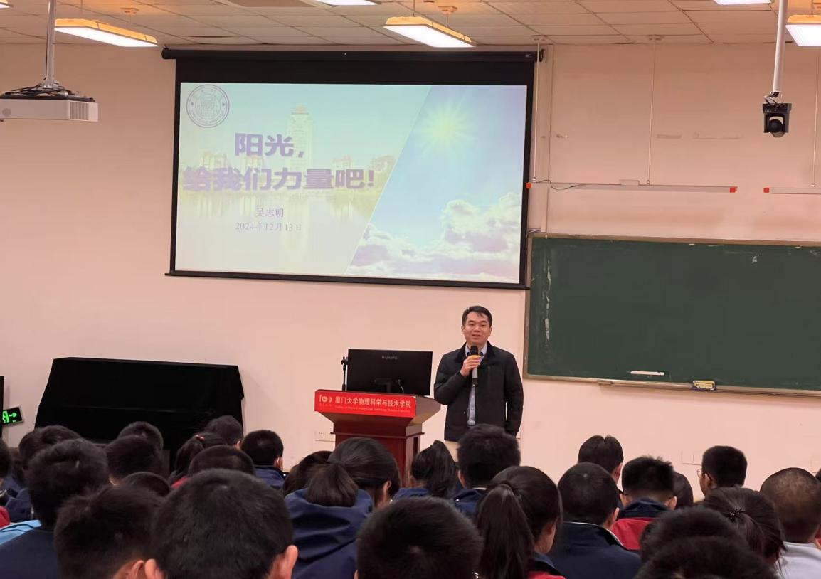 接着我院物理学系副主任吴志明教授举行了“阳光,给我们力量吧!”的精彩讲座,他“中西会通”、“古今交融”循序渐进地介绍了太阳与人类生活、科学研究的密切联系,也给同学们带来了“阳光点亮人生”的建议,赢得了同学们的阵阵掌声。